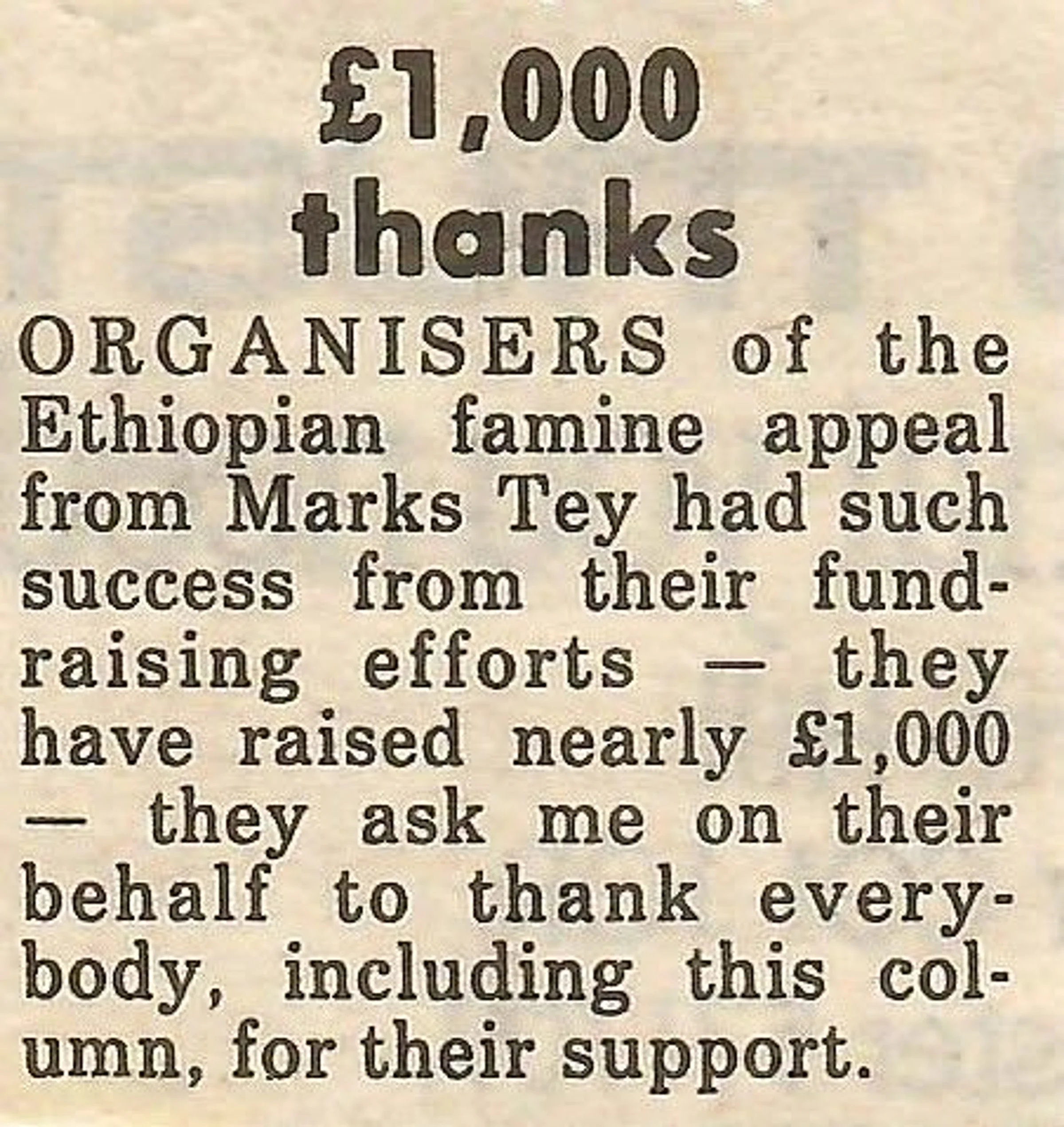 Report on the fundraising Ethiopian famine appeal.