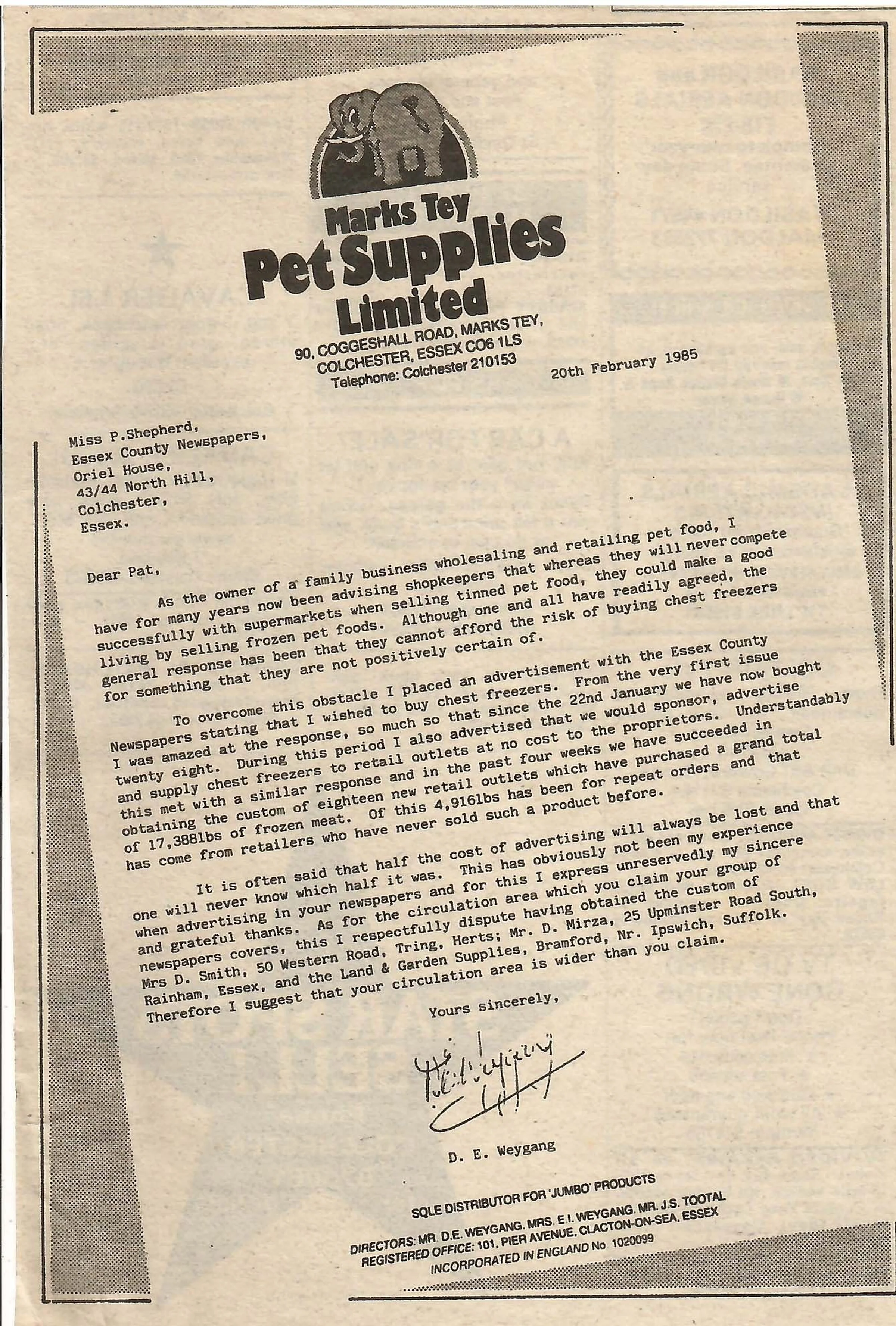 Newspaper advertisement for Marks Tey Pet Supplies.