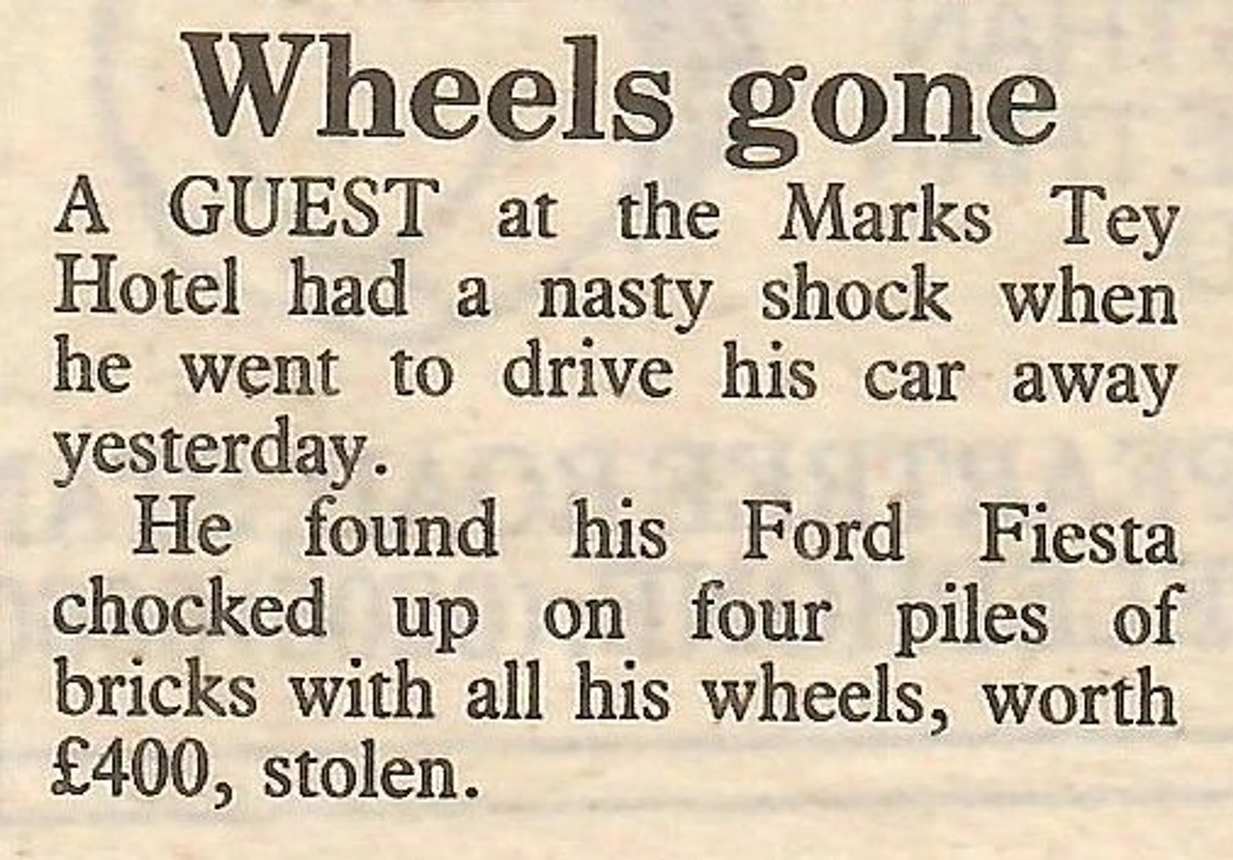 Newspaper report on the theft of car wheels at the Marks Tey Hotel.