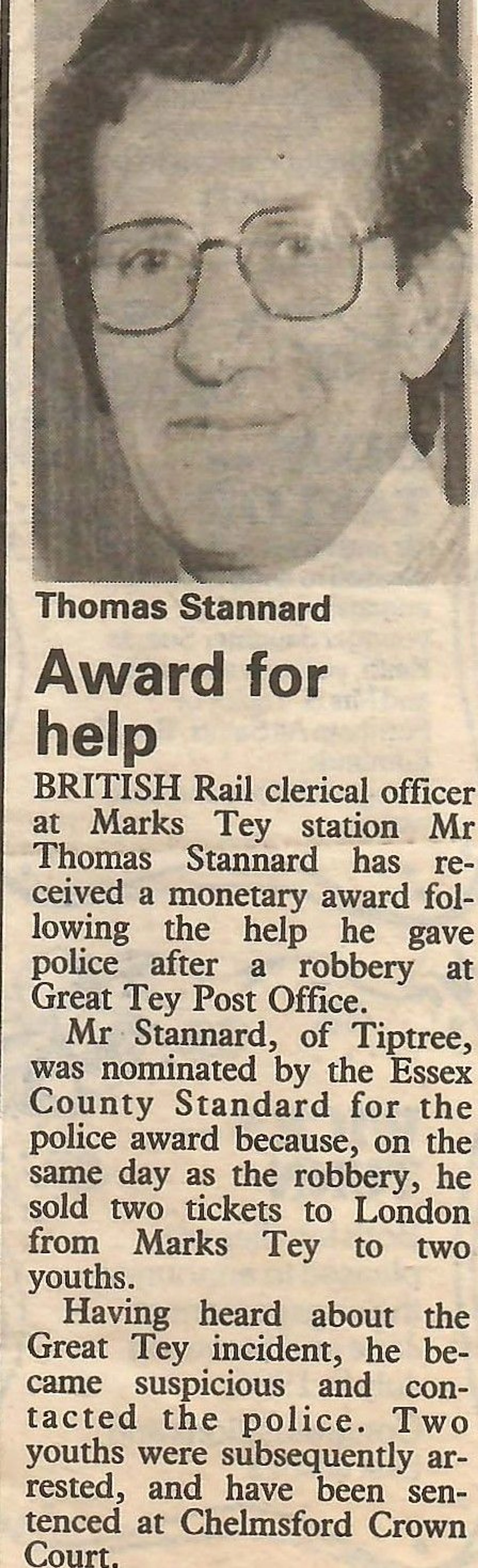 Newspaper photograph and report regarding Thomas Stannar's award following a robbery.