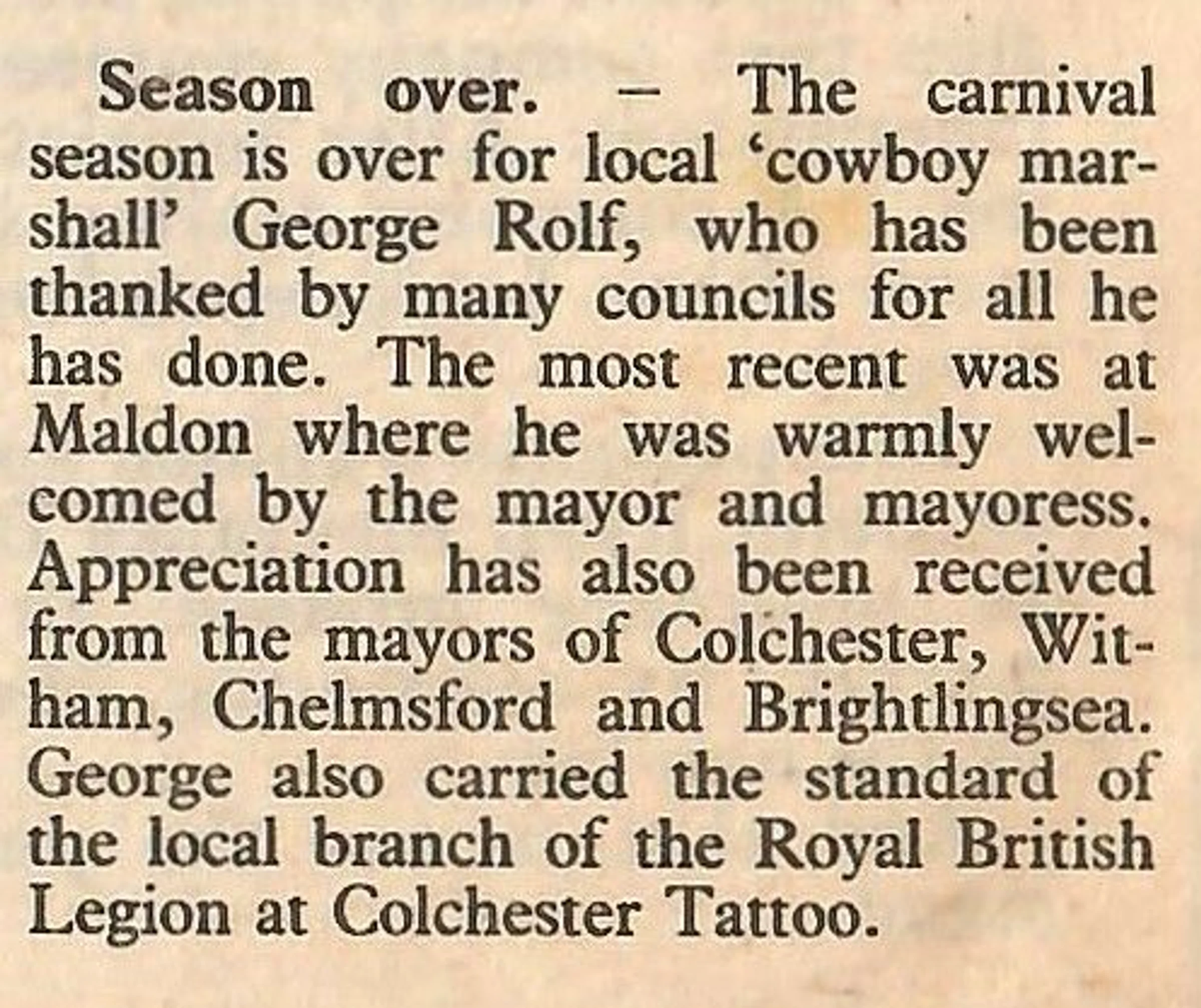 Newspaper report regarding the end of carnival season for 'cowboy marshall' George Rolf, of the Royal British Legion.