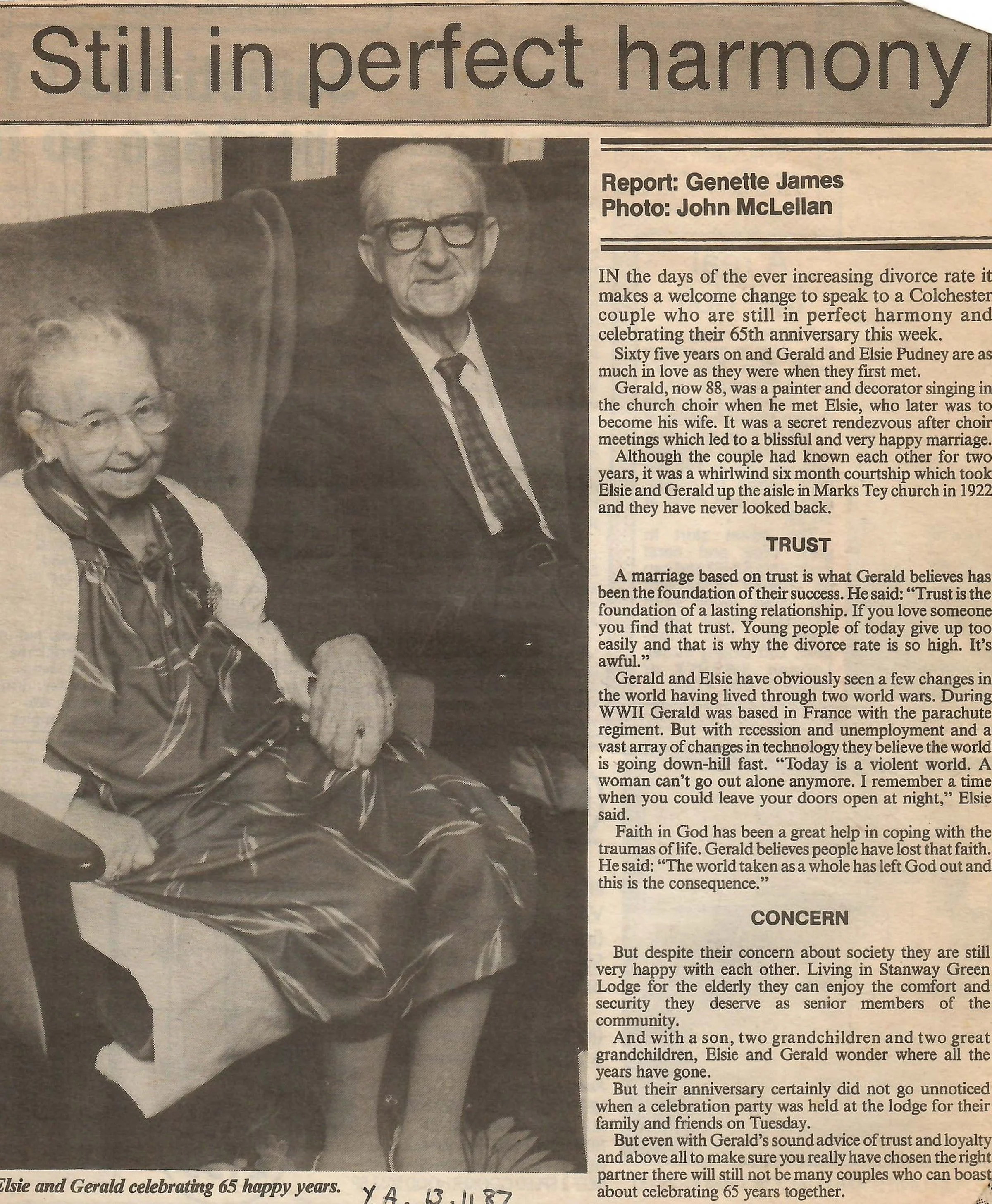 Newspaper photograph and report regarding the 65th wedding anniversary of Gerald and Elsie Pudney, who married in St Andrew's Church in 1922.
