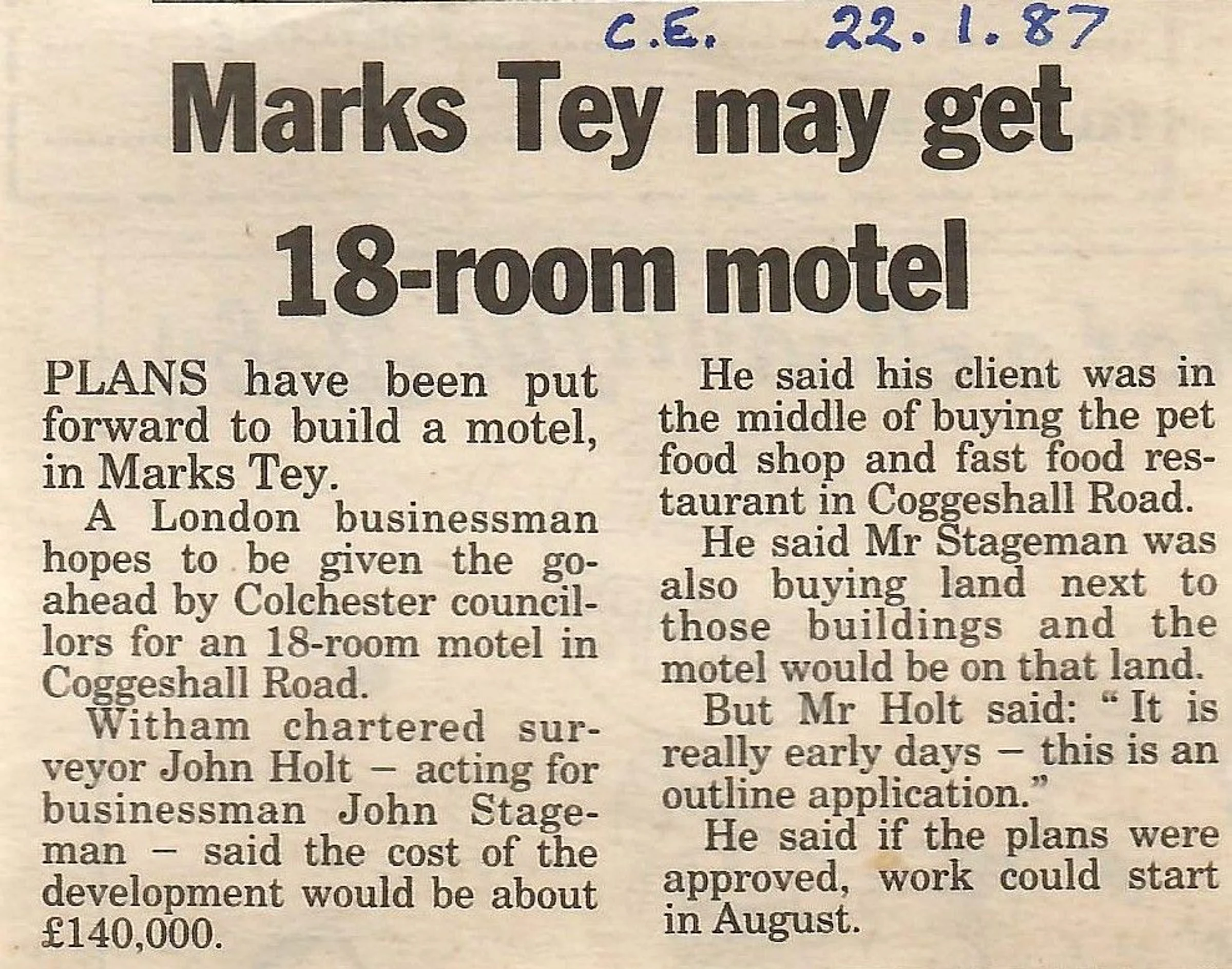 Newspaper article reporting on a planning application to build a motel.