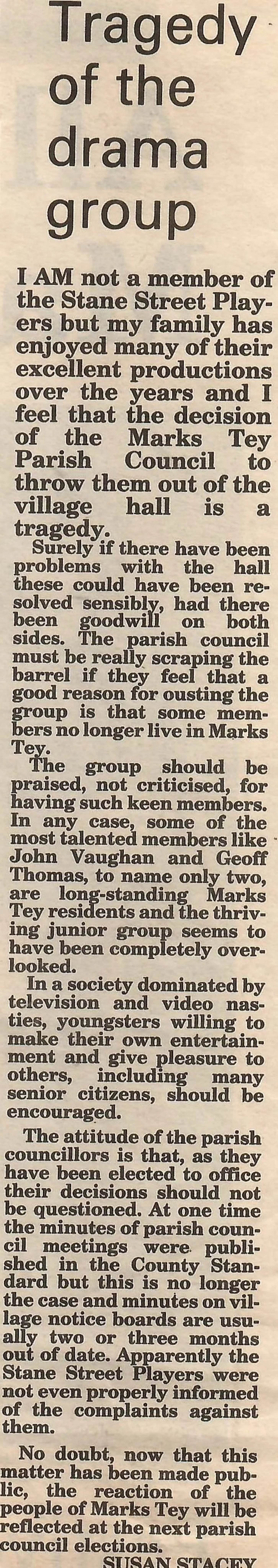 Letter to the Essex County Standard regarding the Stane Street Players.