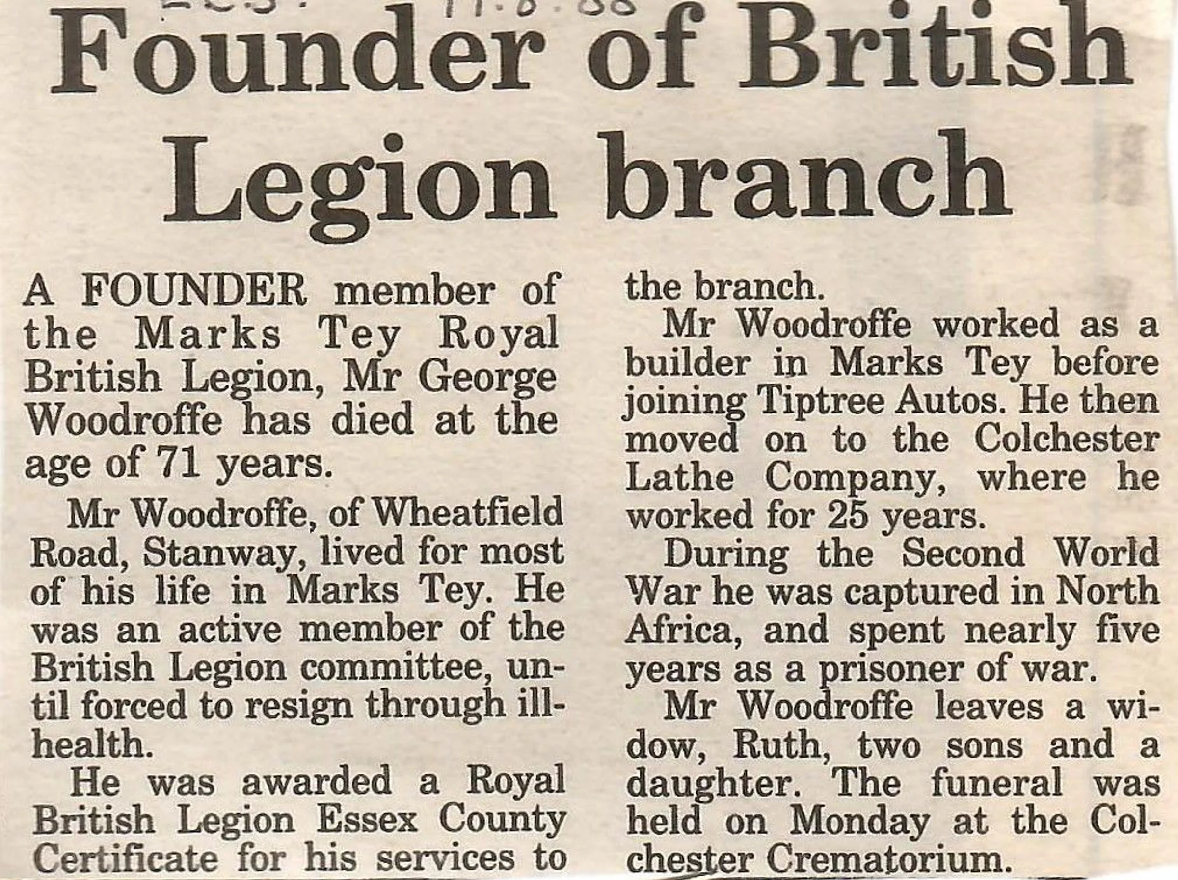 Obituary article for Mr George Woodroffe, of the Marks Tey Royal British Legion.