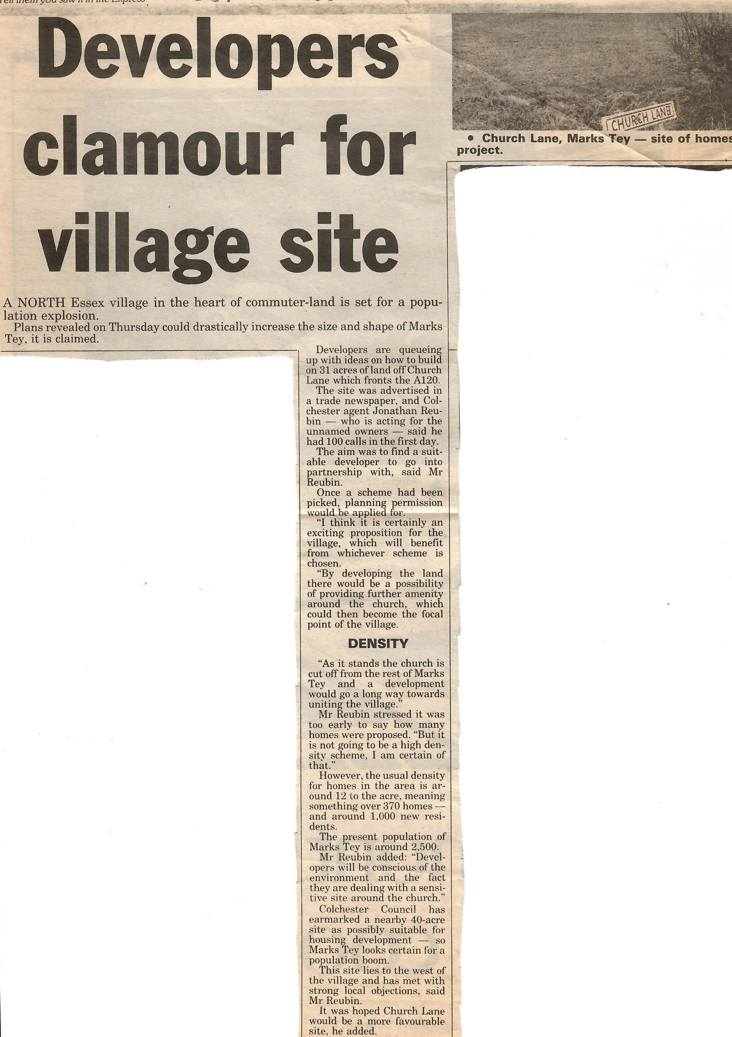 Newspaper report regarding plans for housing along Church Lane and Coggeshall Road.