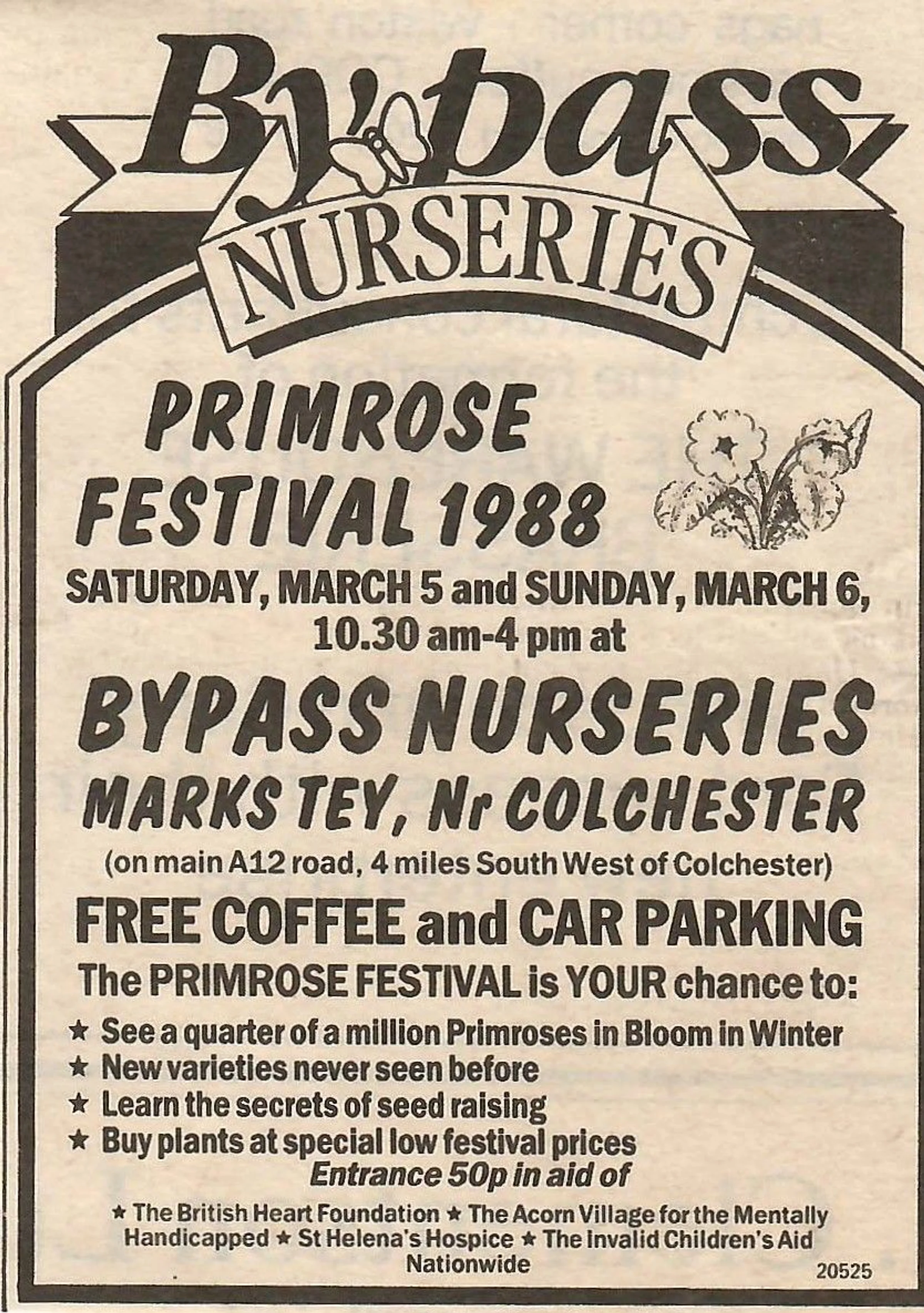 Newspaper advertisement for the primrose festival at By-pass Nurseries.