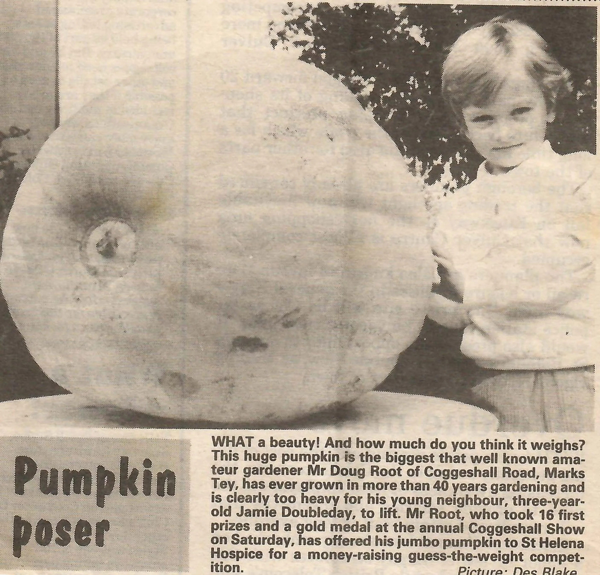 Newspaper photograph and report regarding a prize winning pumkin grown by Doug Root.
