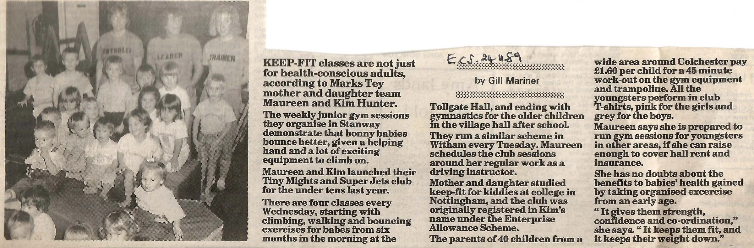 Newspaper photograph and report regarding junior gym classes Tiny Mights and Super Jets run by Maureen and Kim Hunter.