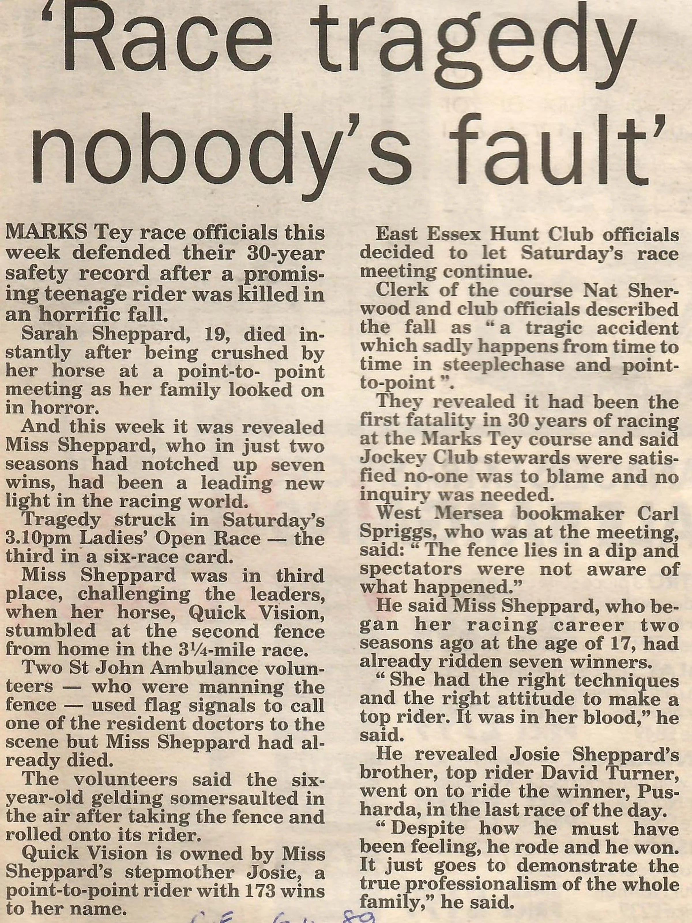 Newspaper report regarding the death of Sarah Sheppard at the East Essex Hunt Club's point-to-point.