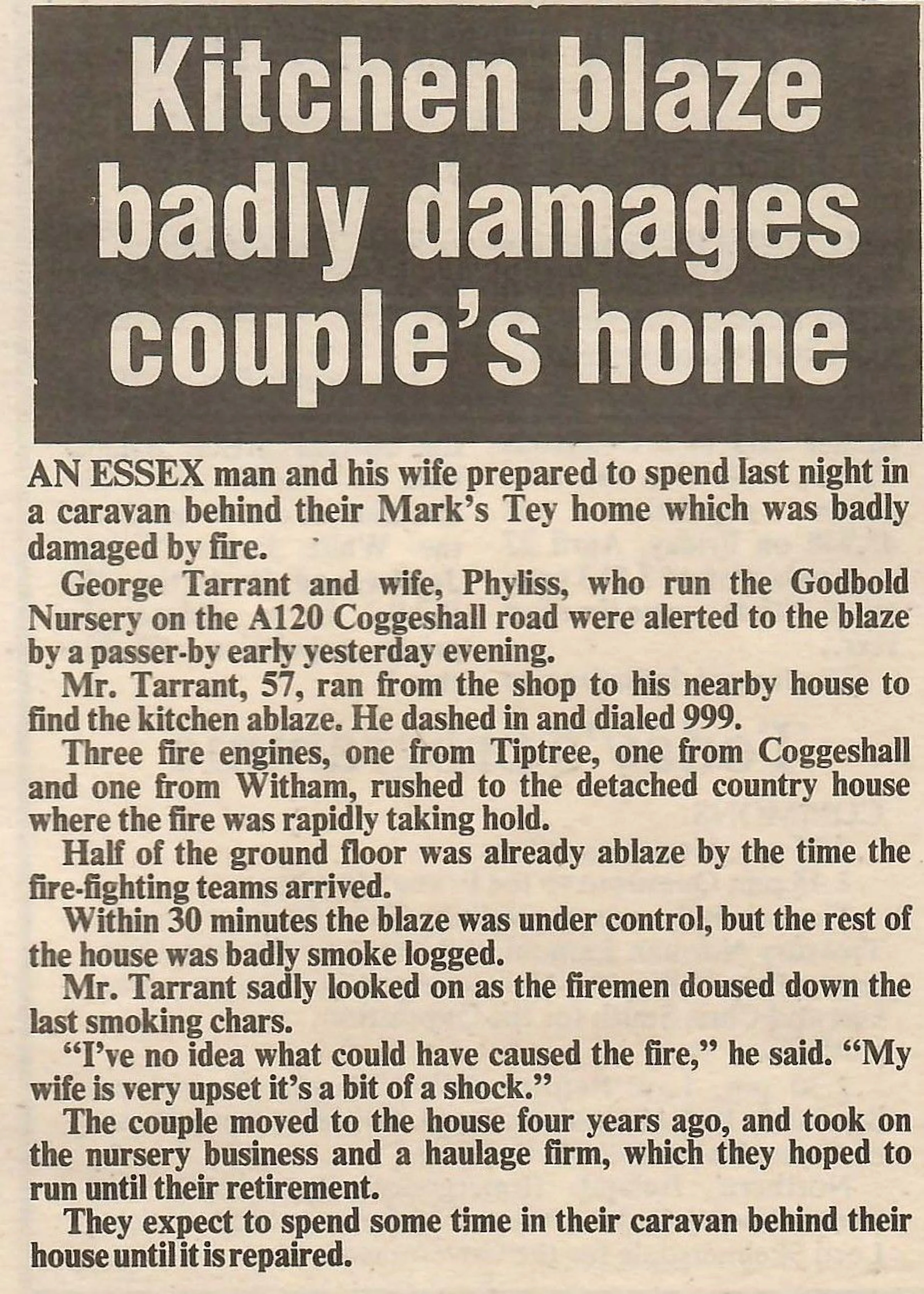 Newspaper report regarding a house fire at Godbolts Nursery.