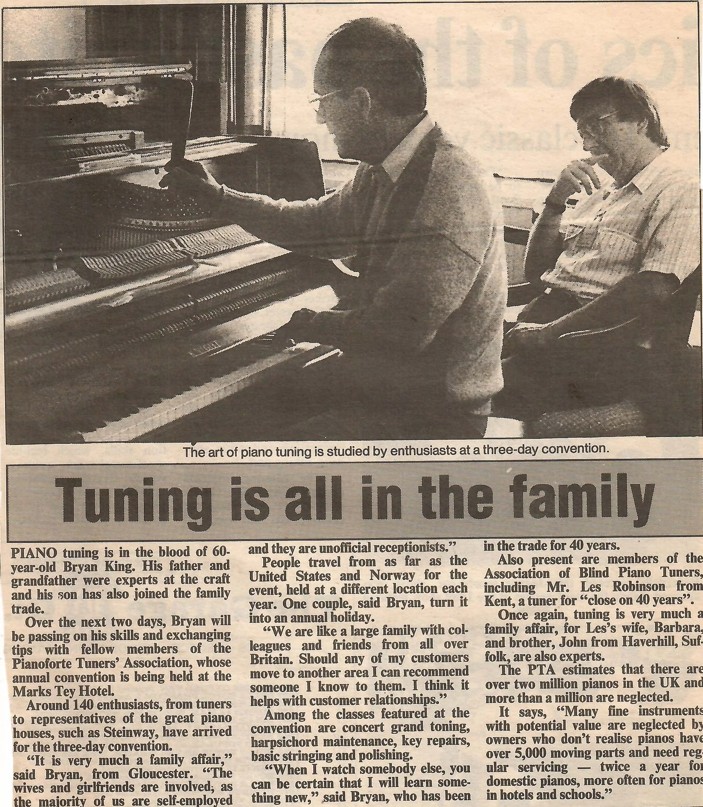 Newspaper photograph and report regarding piano tuner Bryan King and a conference at the Marks Tey Hotel.