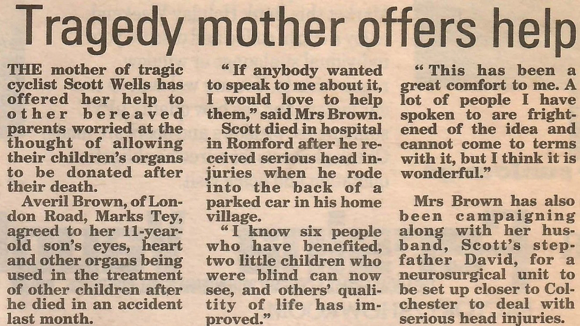 Newspaper report regarding campaigning for organ donation by Averil Brown, following the death of her son Scott after an accident on the estate.