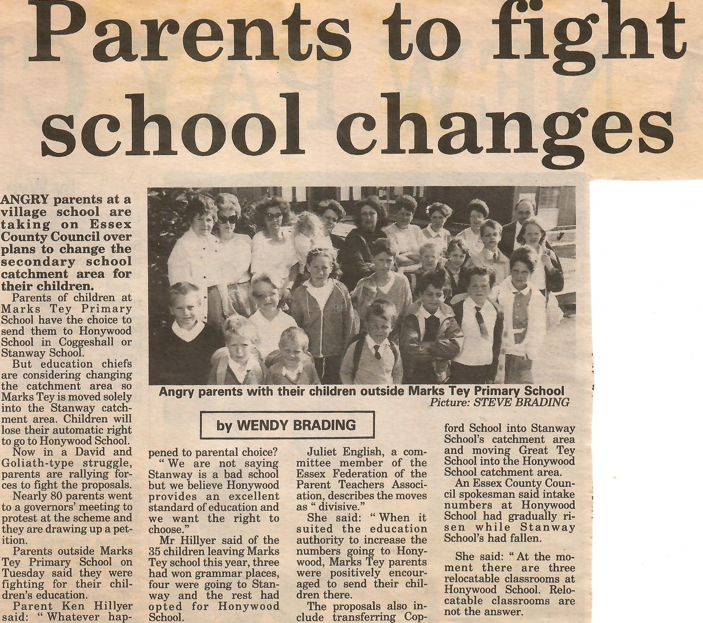 Newspaper photograph and report regarding the secondary school catchment areas.