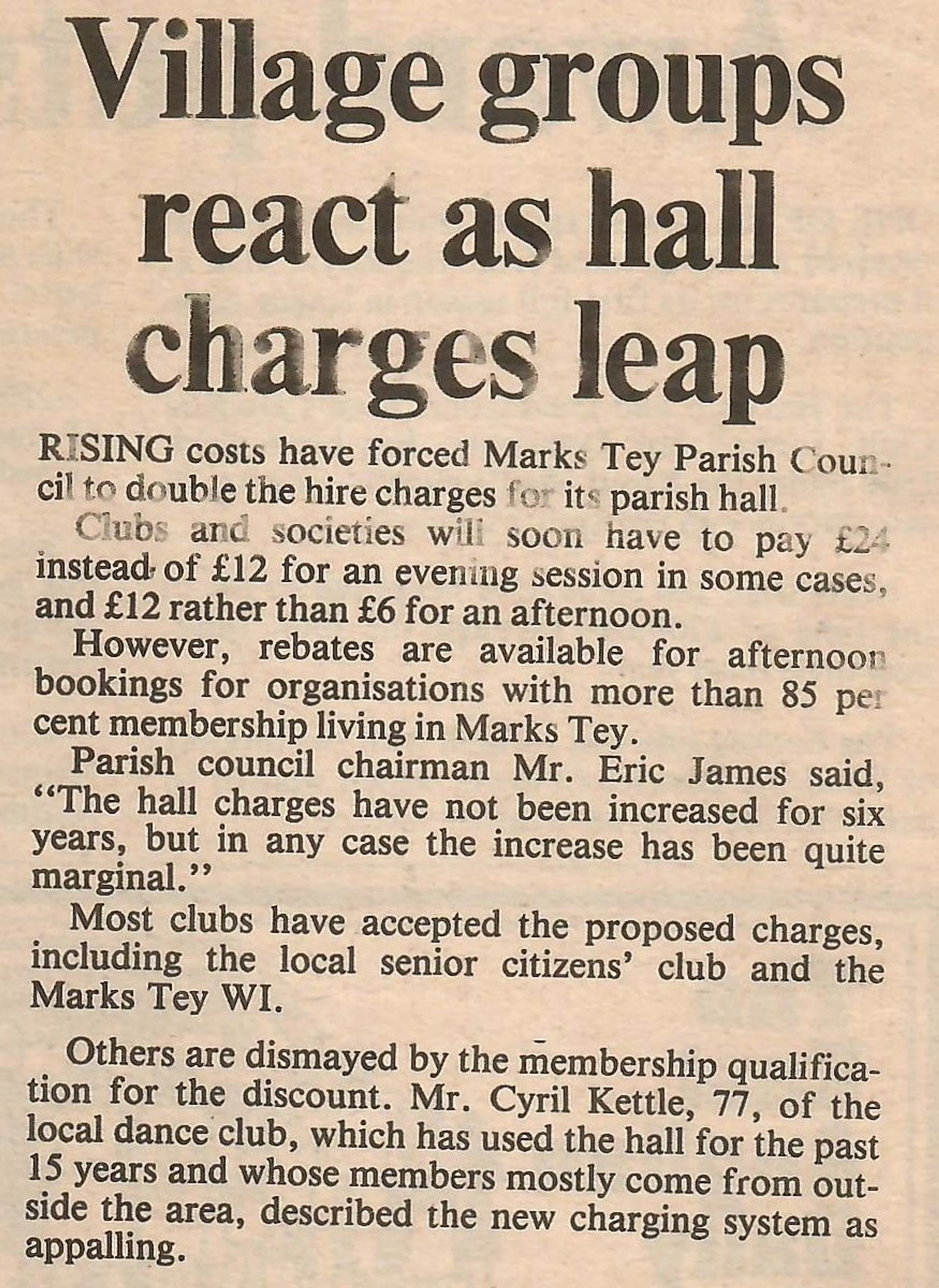 Newspaper article reporting on the change in hire charges for the parish hall.