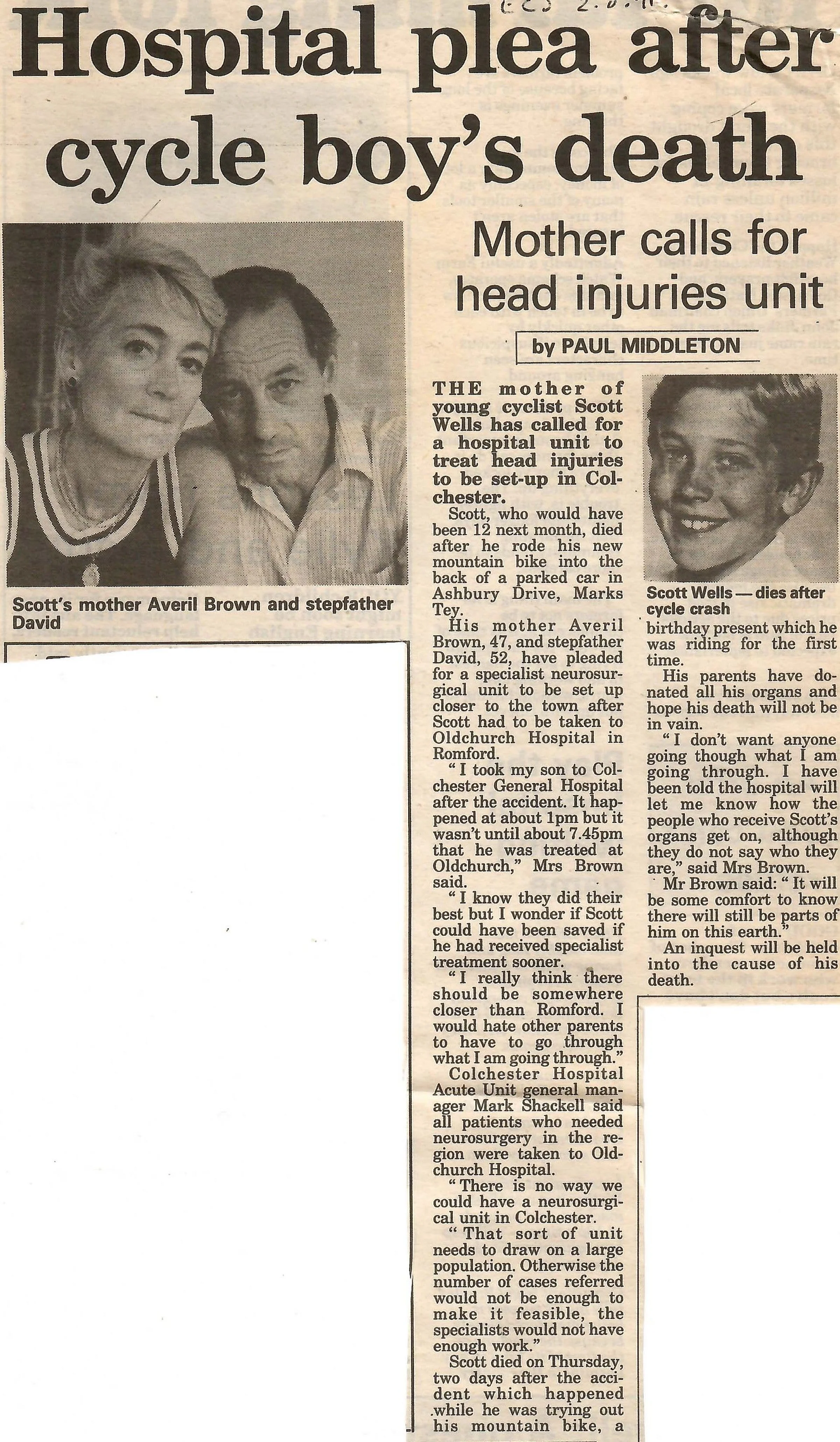 Newspaper photographs and article regarding campaigning by Averil Brown to establish a head injuries unit in Colchester, following the death of her son Scott Wells on the estate.