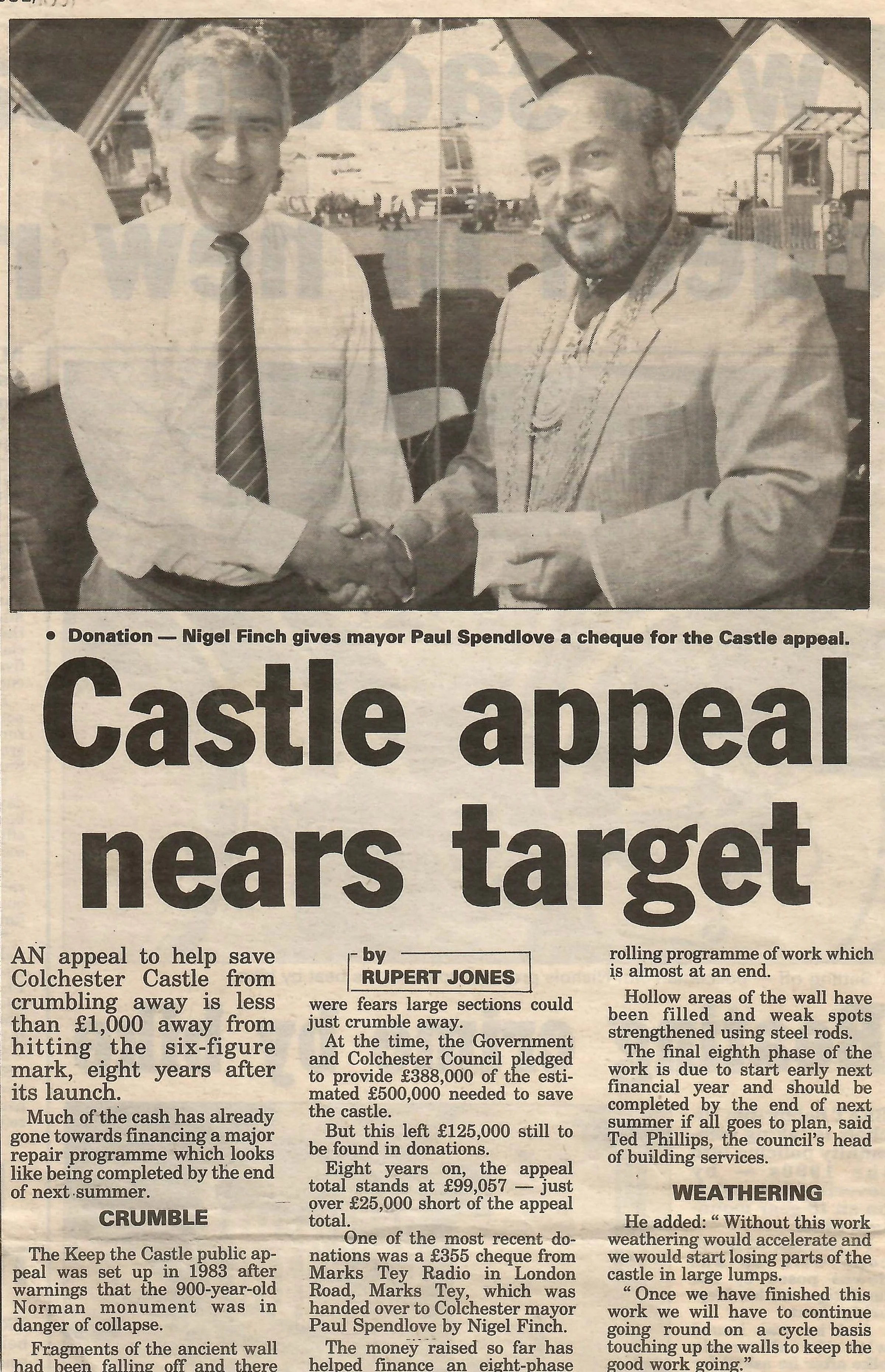 Newspaper photograph and article on the Keep the Castle appeal and support from Marks Tey Radio, with Nigel Fitch (misspelt Finch).
