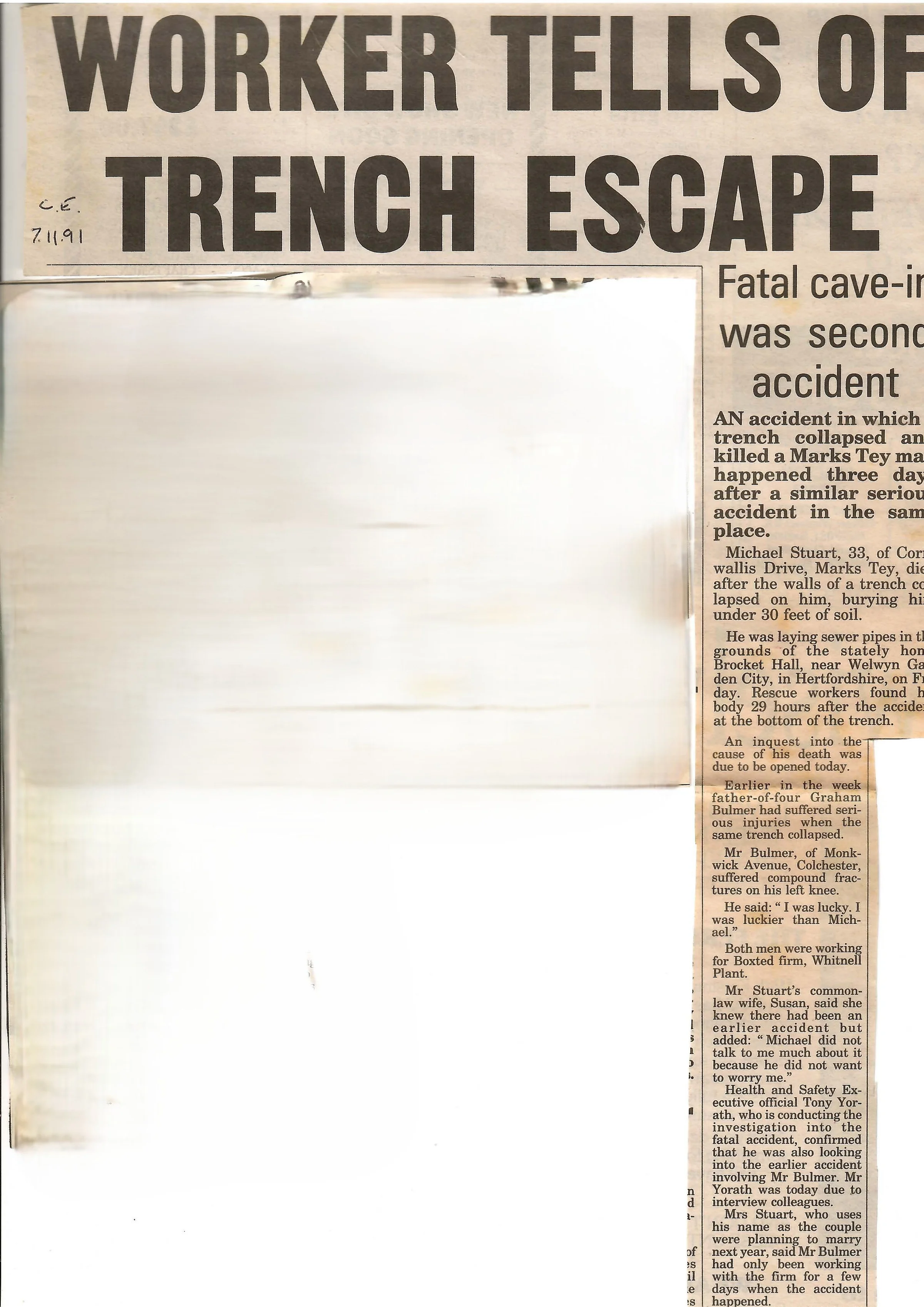 Newspaper report regarding the death of Michael Stuart following an accident at work in Hertfordshire.