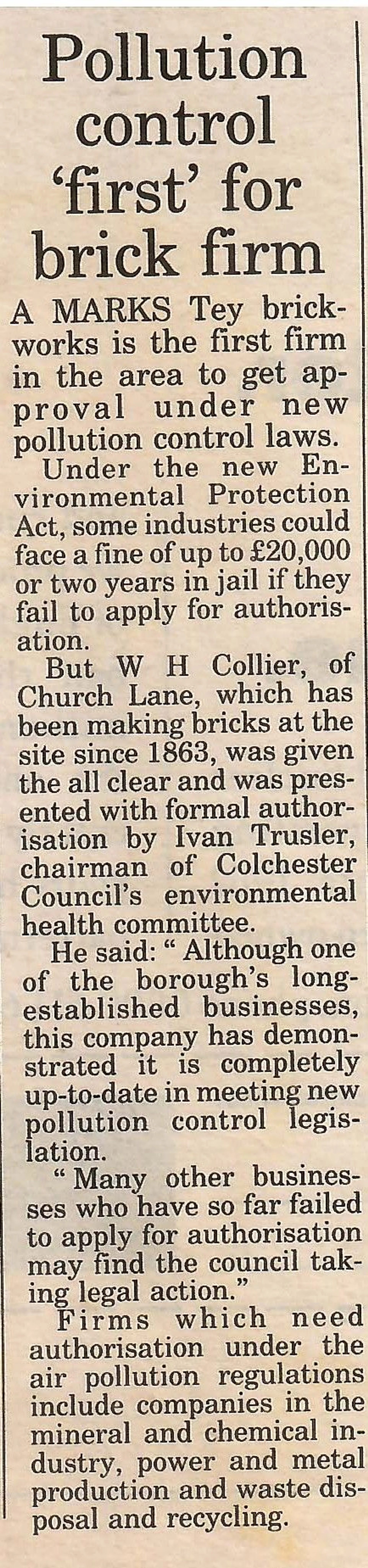 Newspaper report on new pollution laws and W. H. Colliers.
