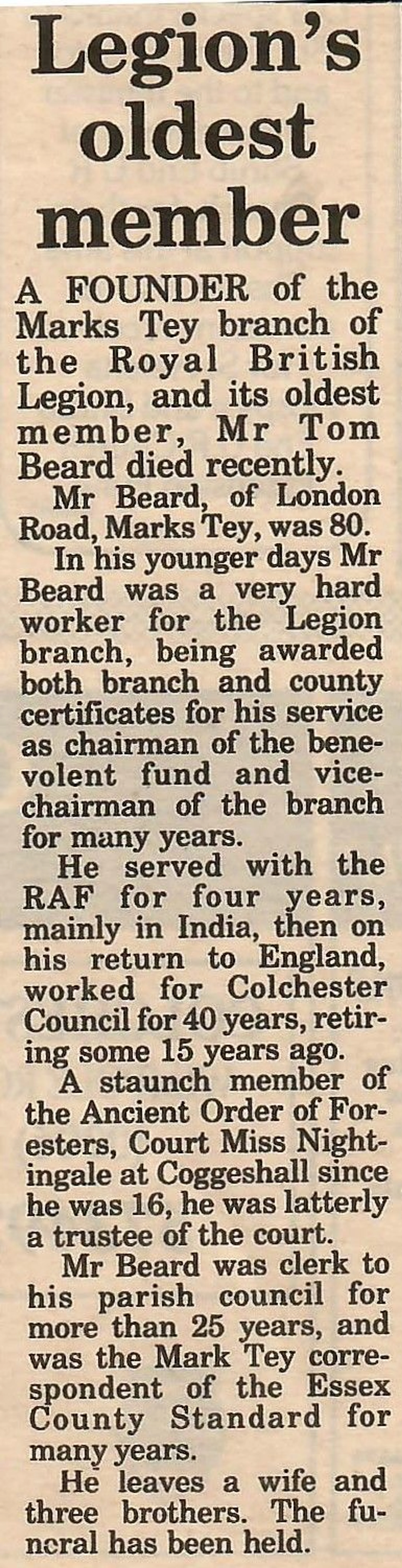 Obituary article for Mr Tom Beard, oldest member of the Royal British Legion branch.