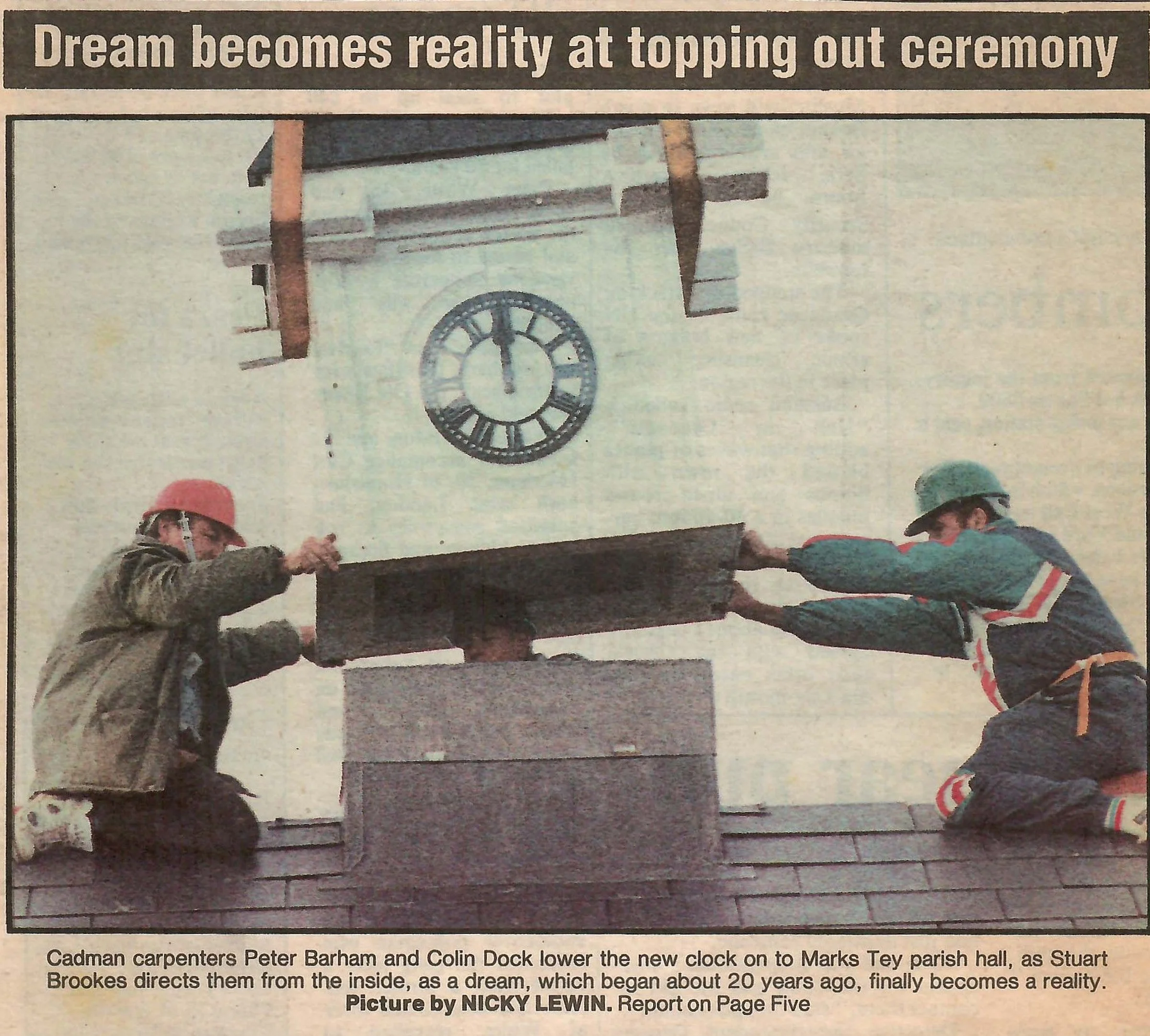 Newspaper photograph reporting on the installation of the clock at the new parish hall topping out ceremony.