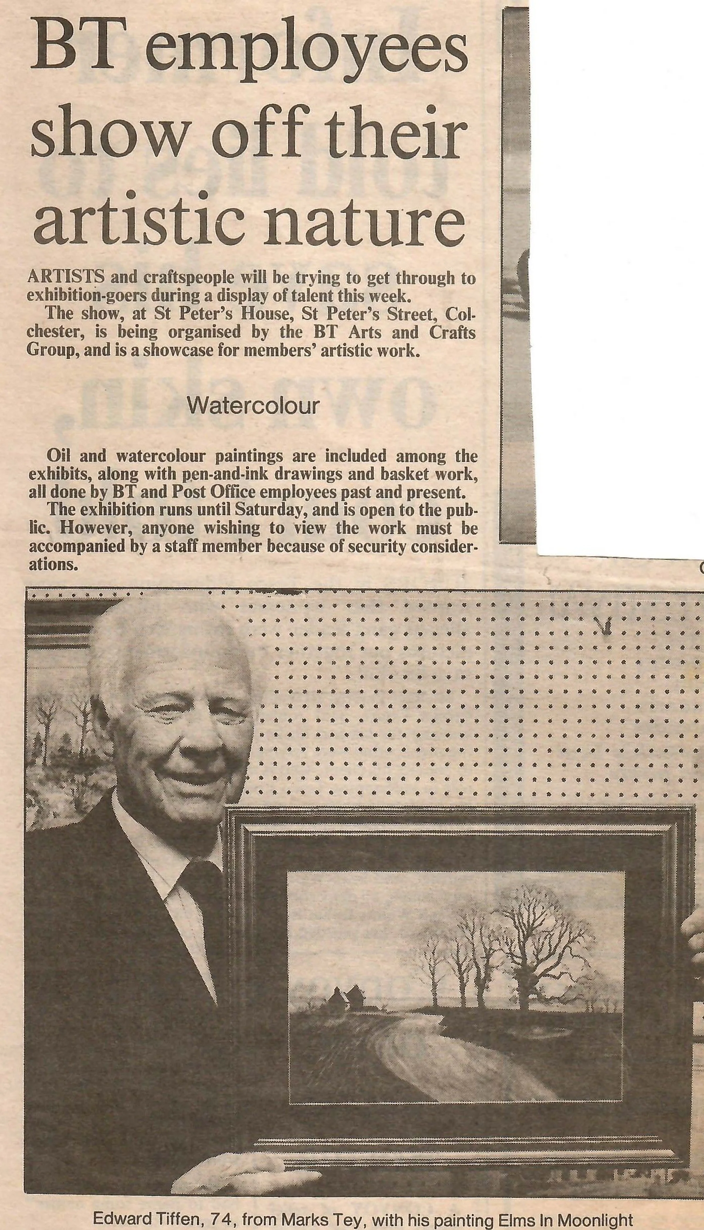 Newspaper photograph and report regarding an art exhibition in Colchester, including work by Edward Tiffen of Marks Tey.