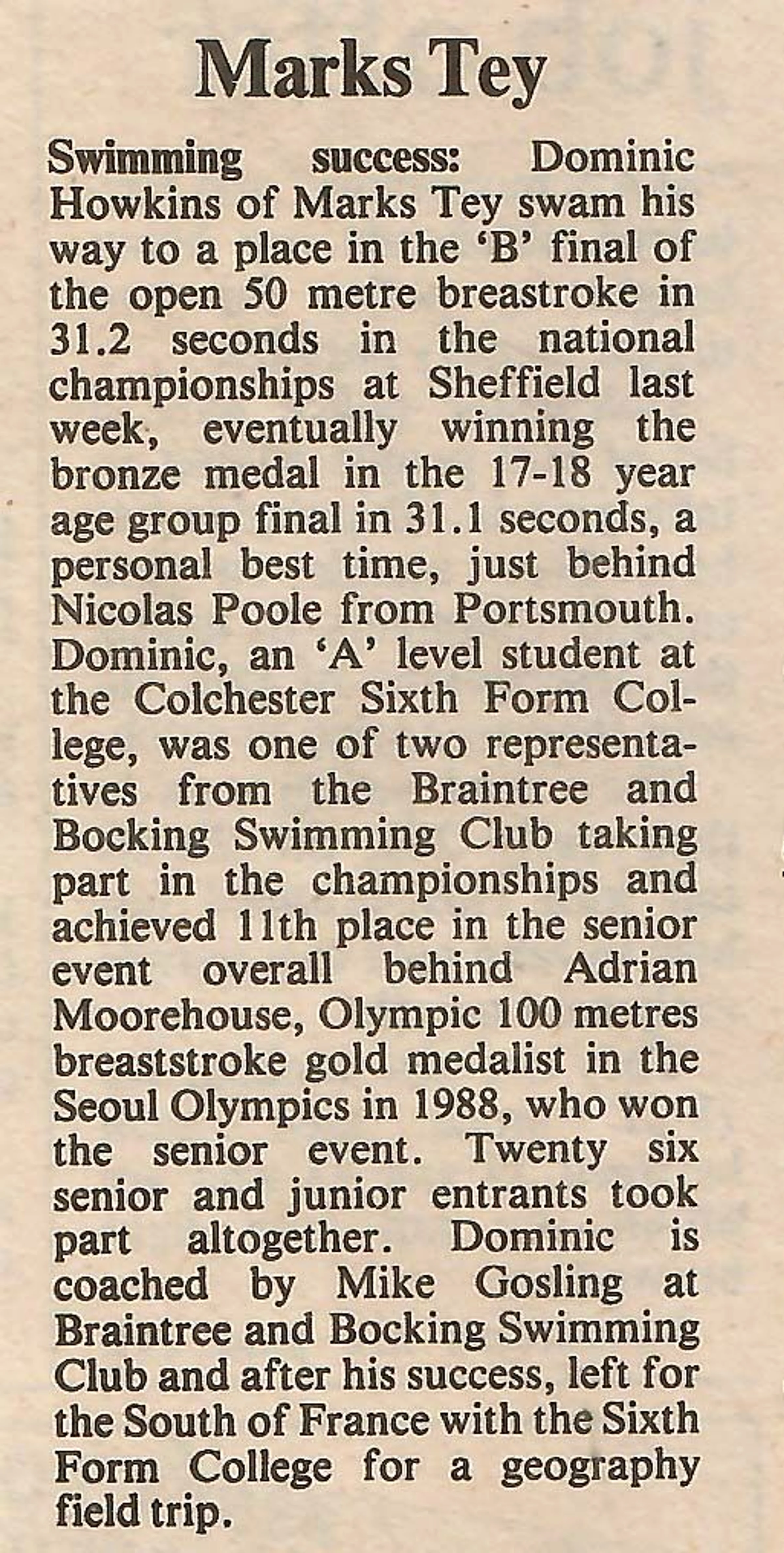 Newspaper photograph and report regarding Dominic Howkins' participation in national swimming championships.