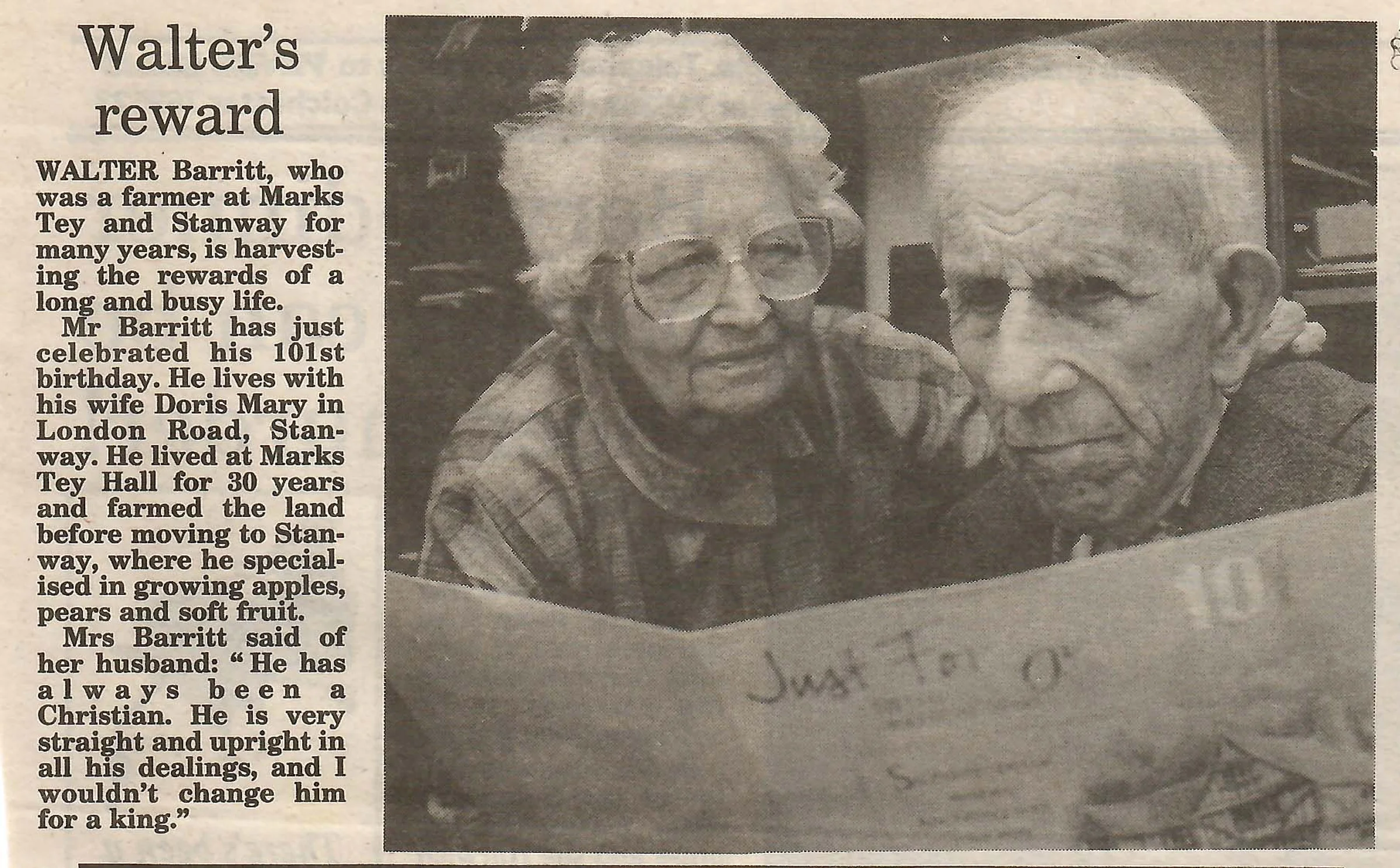 Newspaper photograph and report regarding the 101st birthday of Walter Barritt.