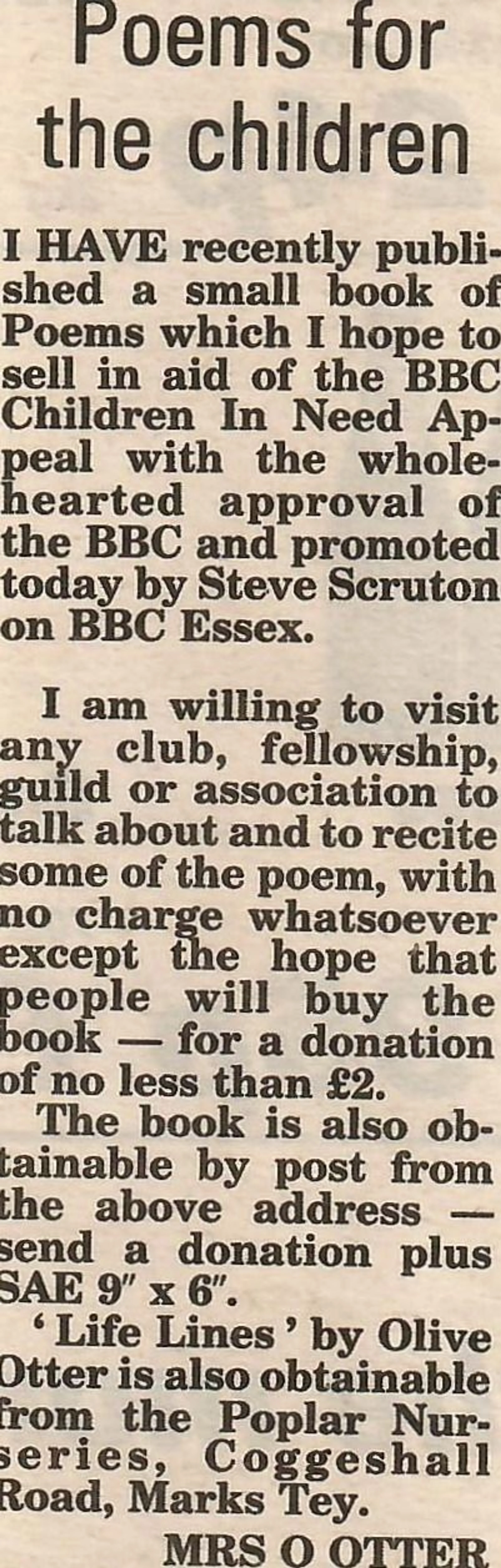 Newspaper letter by Mrs O. Otter regarding her charity poetry book.