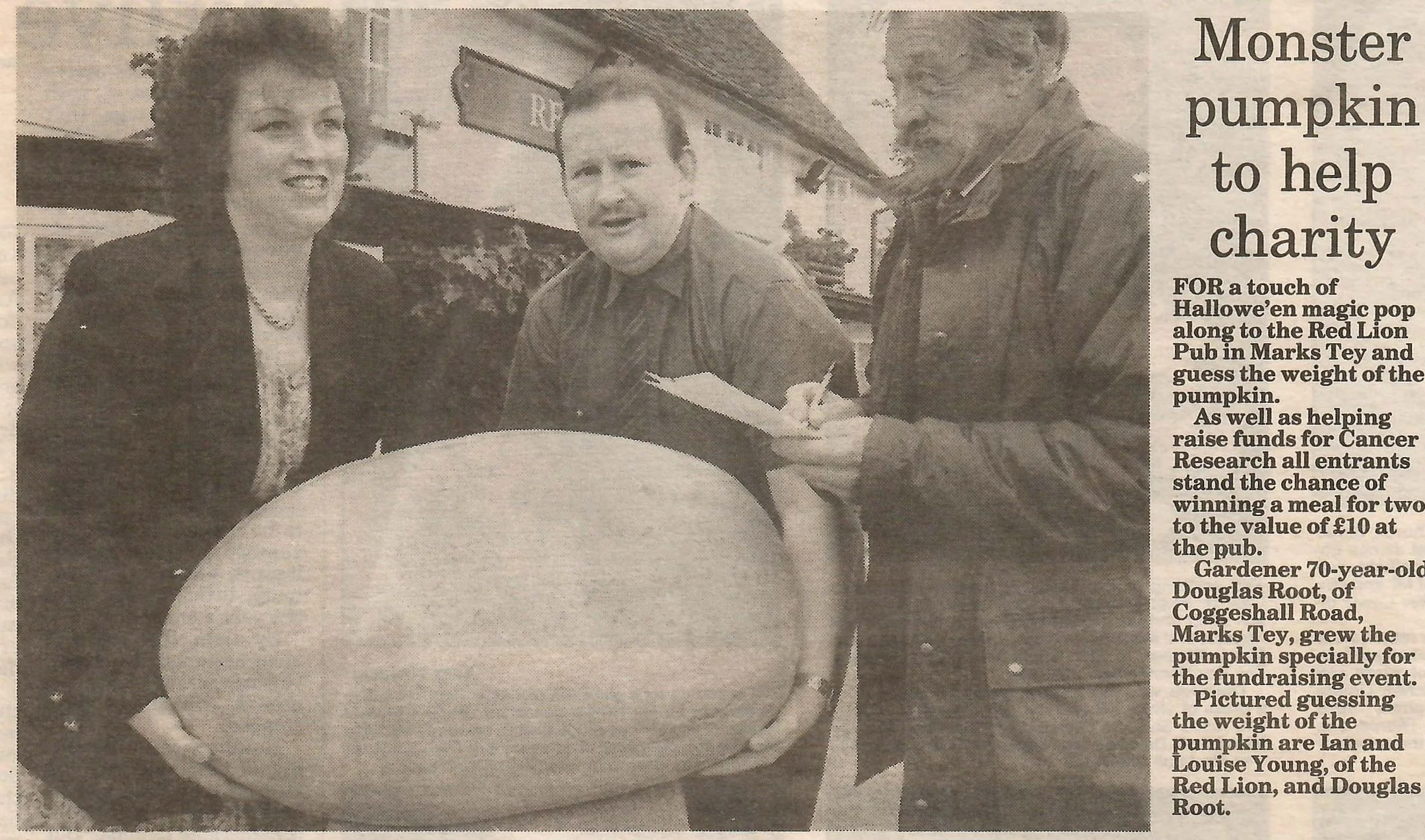 Newspaper photograph and report on the charity pumpkin fundraiser at the Red Lion.