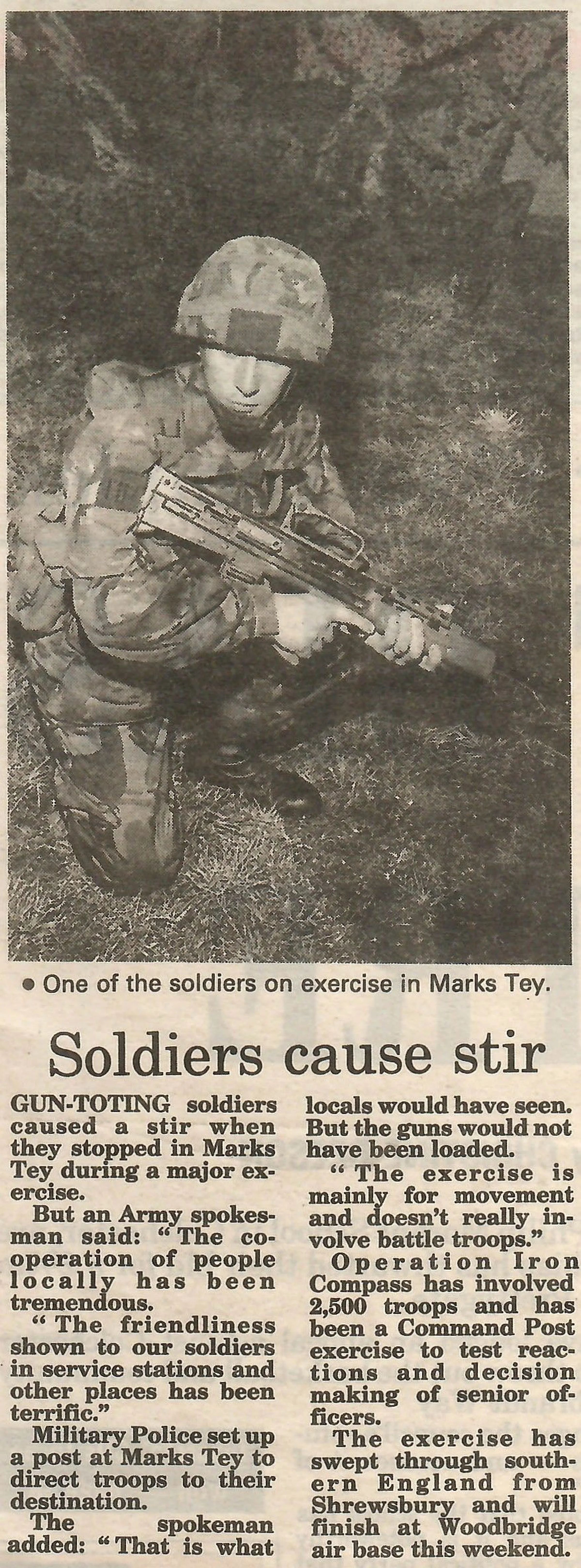 Newspaper photograph and report regarding a military exercise that took place in Marks Tey.