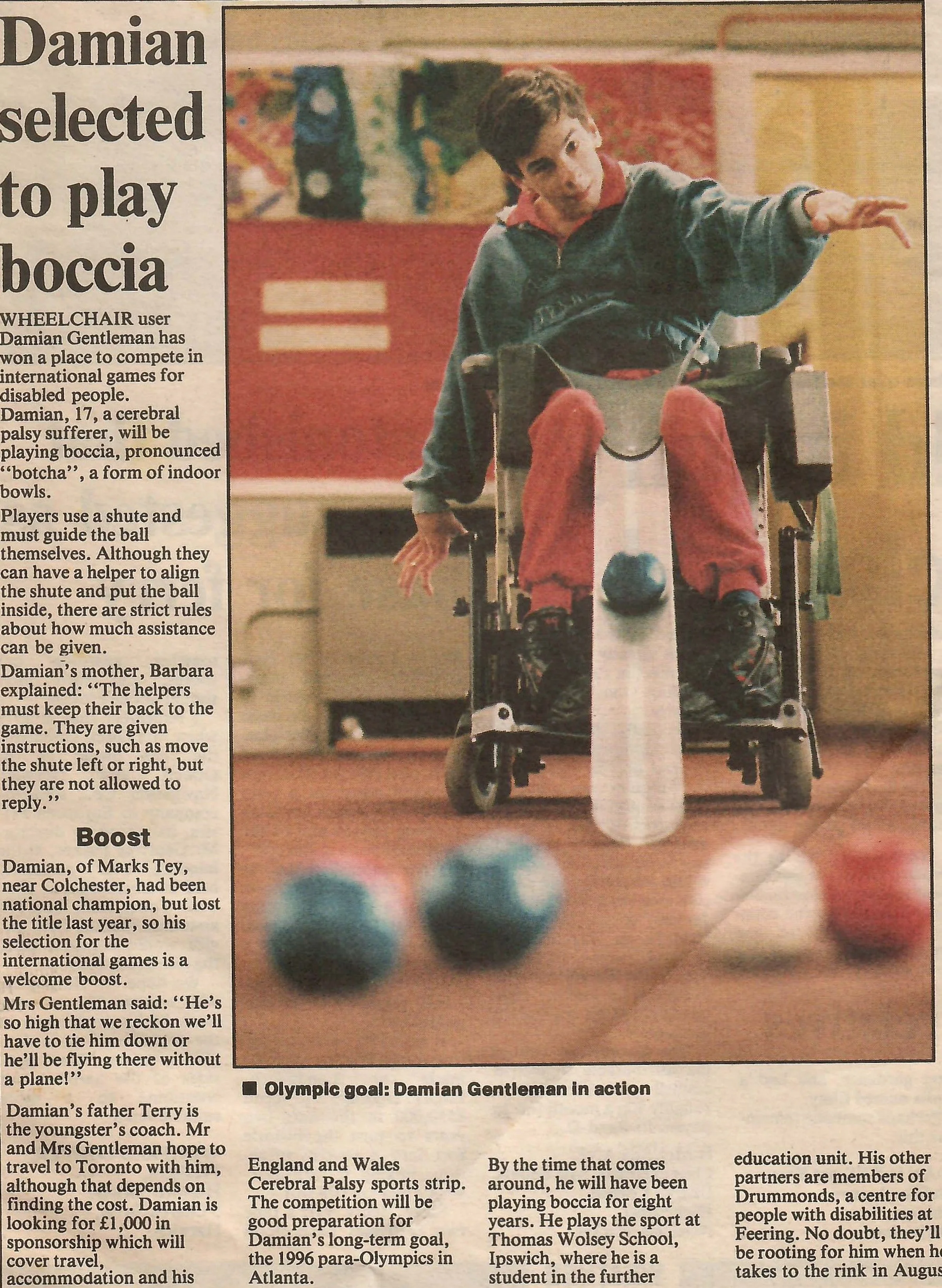 Newspaper photograph and report regarding Damian Gentleman's place at the international games.