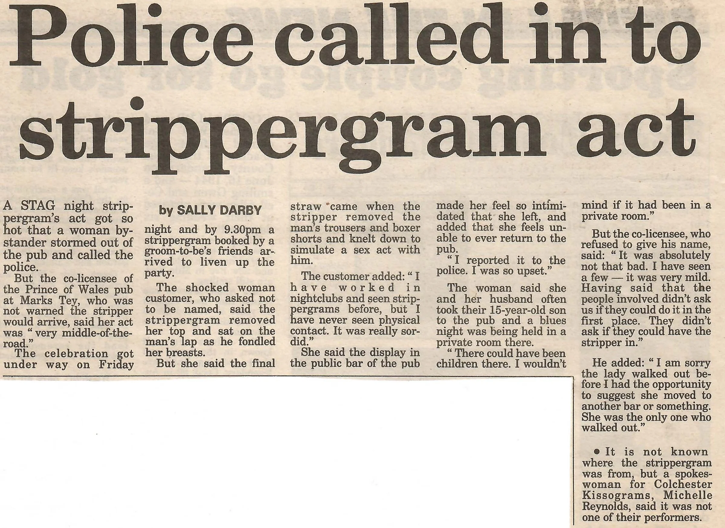 Newspaper report on a police call to a stag night at the Prince of Wales public house.
