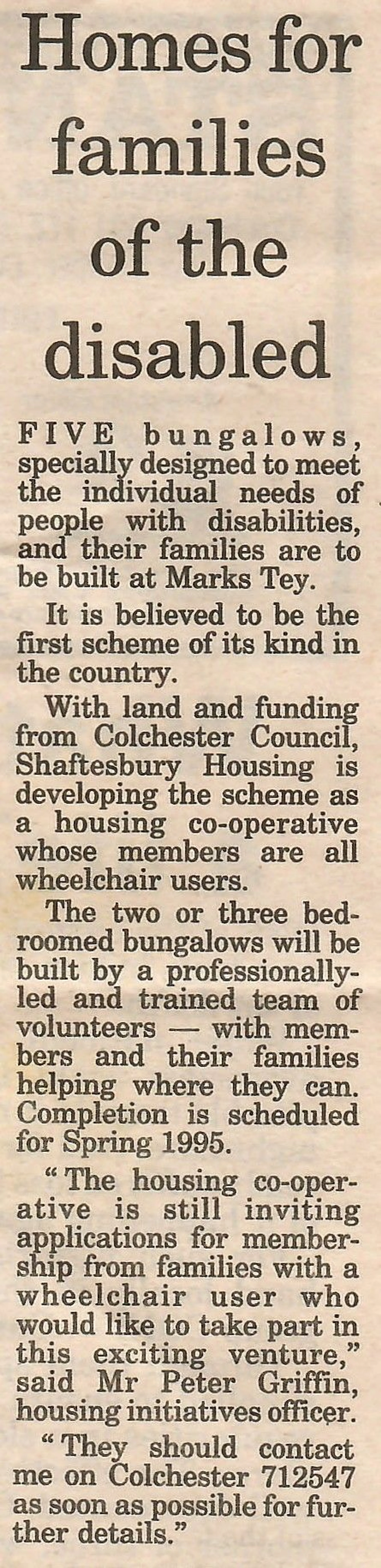 Newspaper report regarding plans for a scheme to support self build bungalows for residents with disabilities.