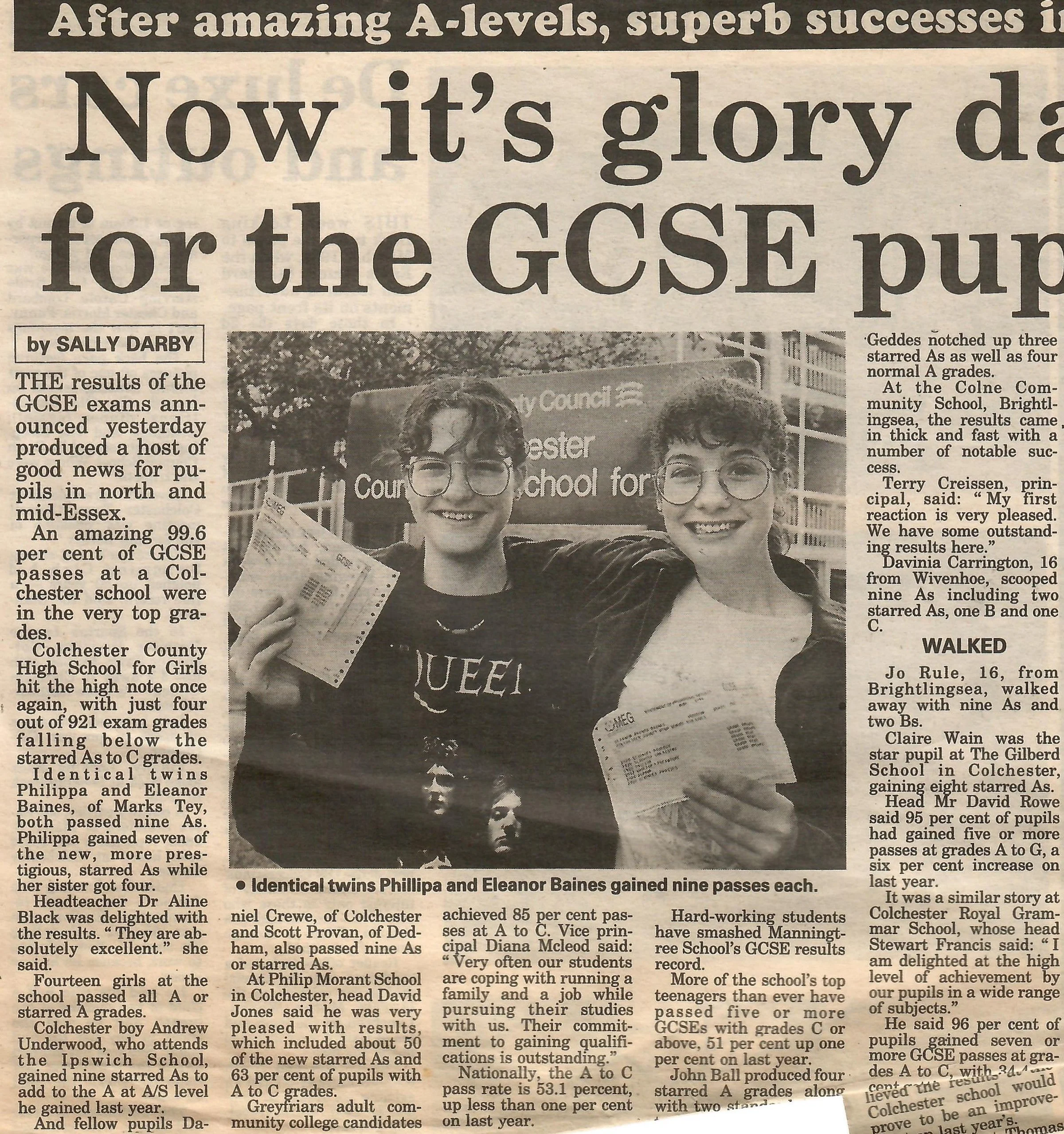Newspaper photograph and report following GCSE results, including Phillipa and Eleanor Baines.