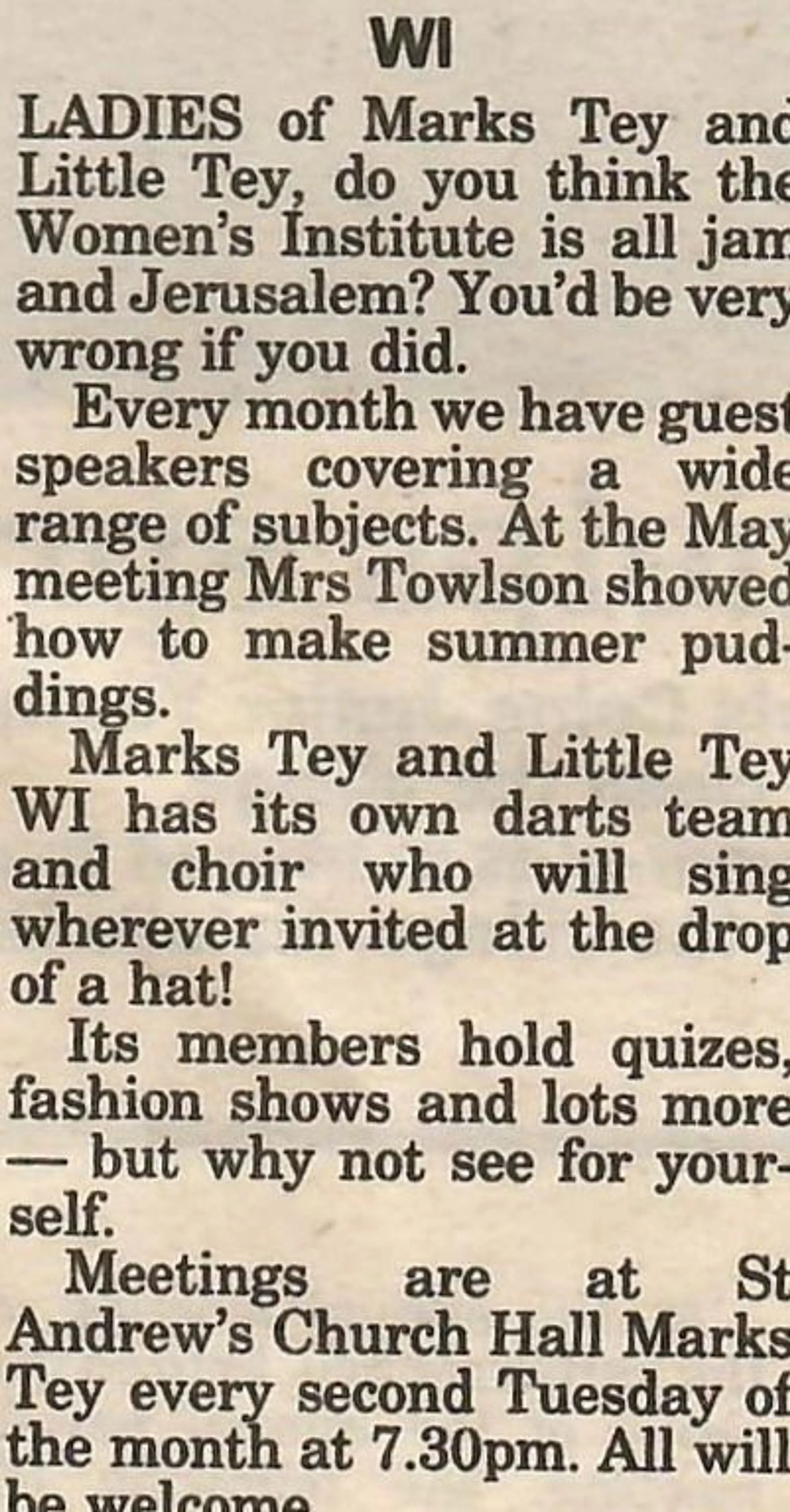 Village news column reporting on the meeting of the Women's Institute.