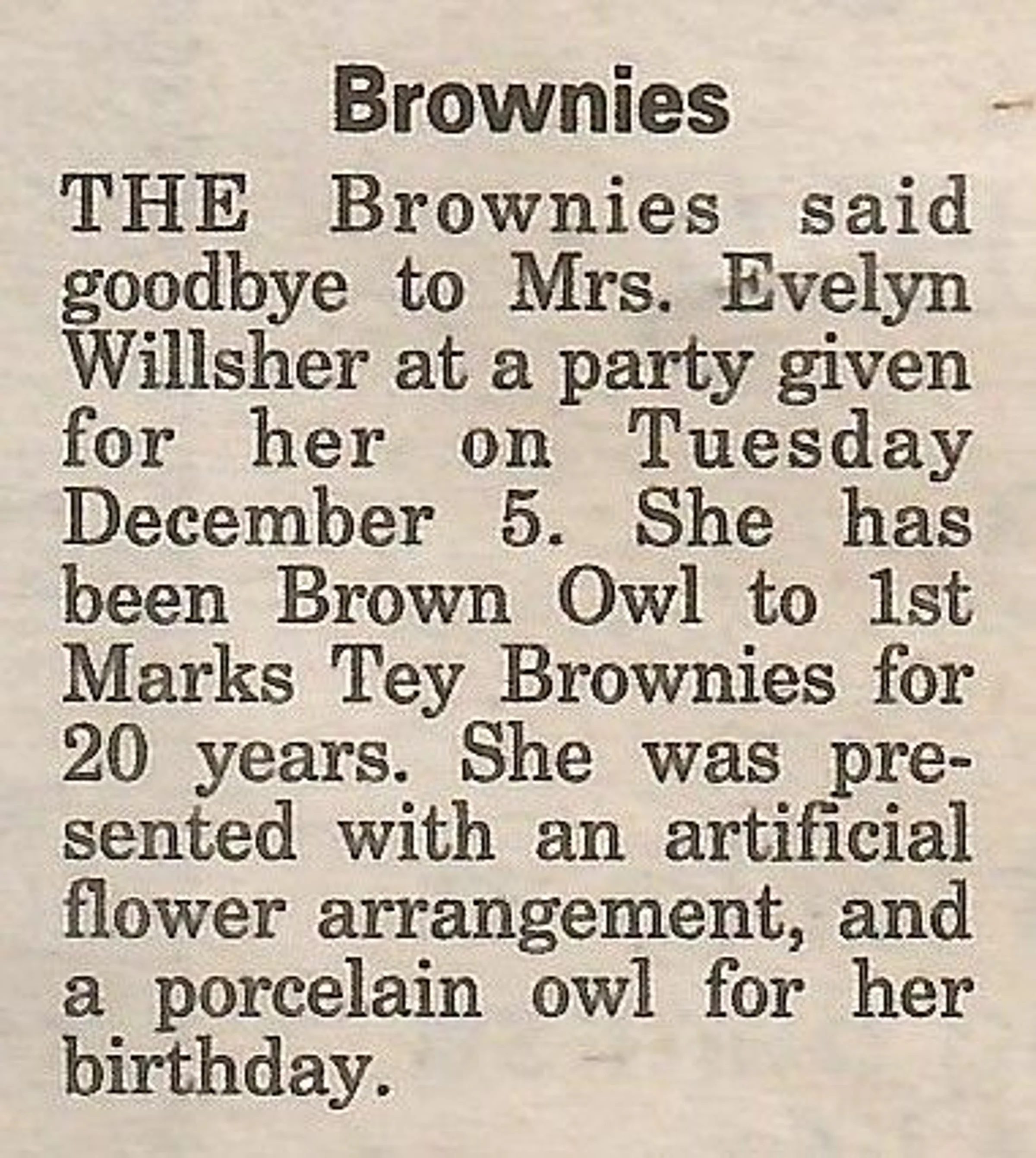 Village news column reporting on the retirement of Evelyn Willsher as Brown Owl.