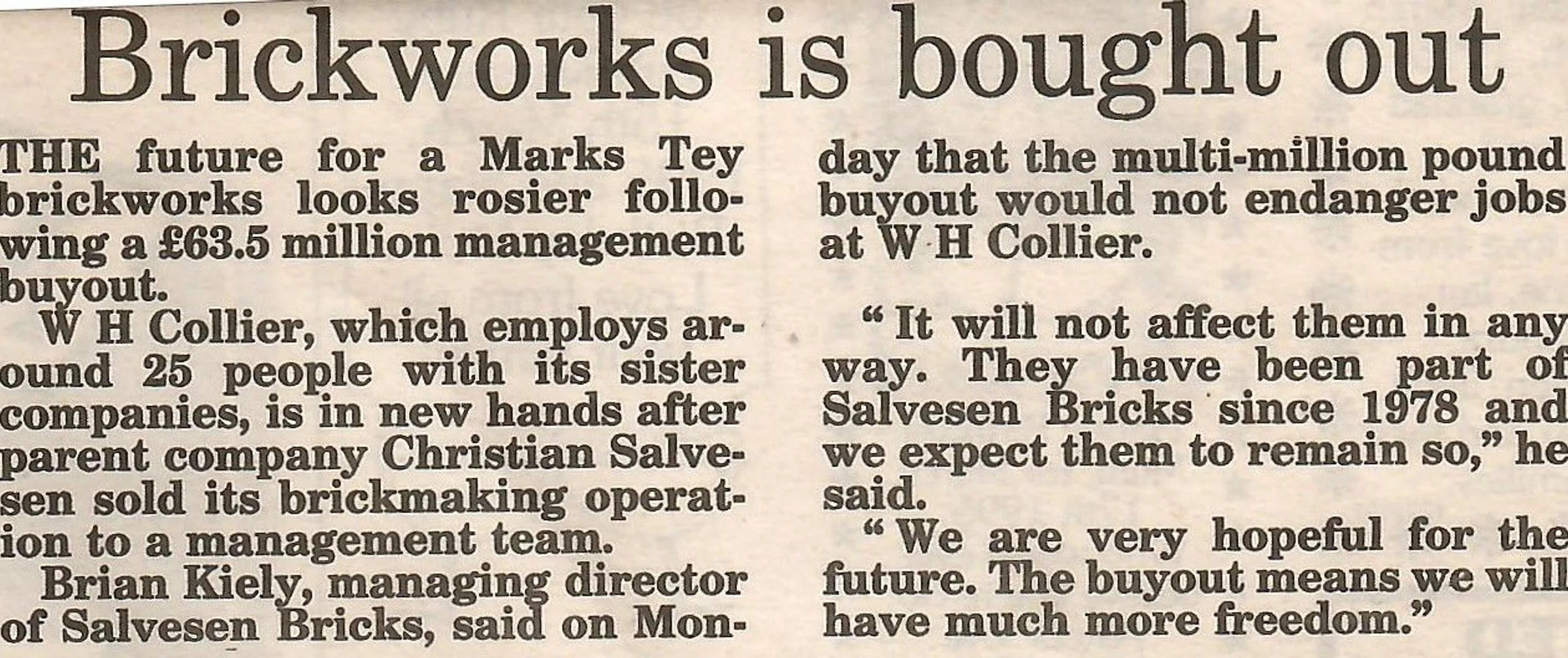 Newspaper report on the purchase of W H Collier by new management at Salvensen Bricks.