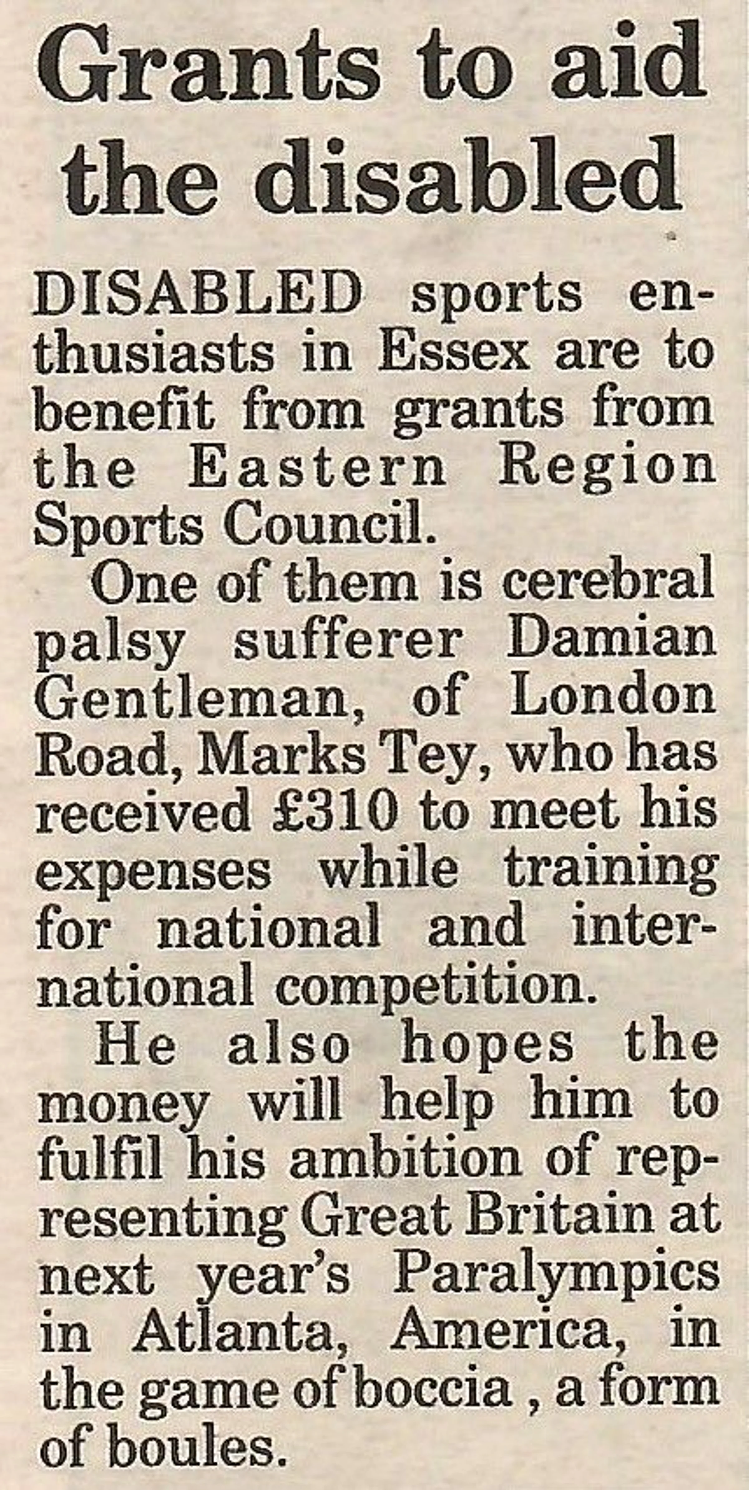 Newspaper report regarding Damian Gentleman and a grant for competition.