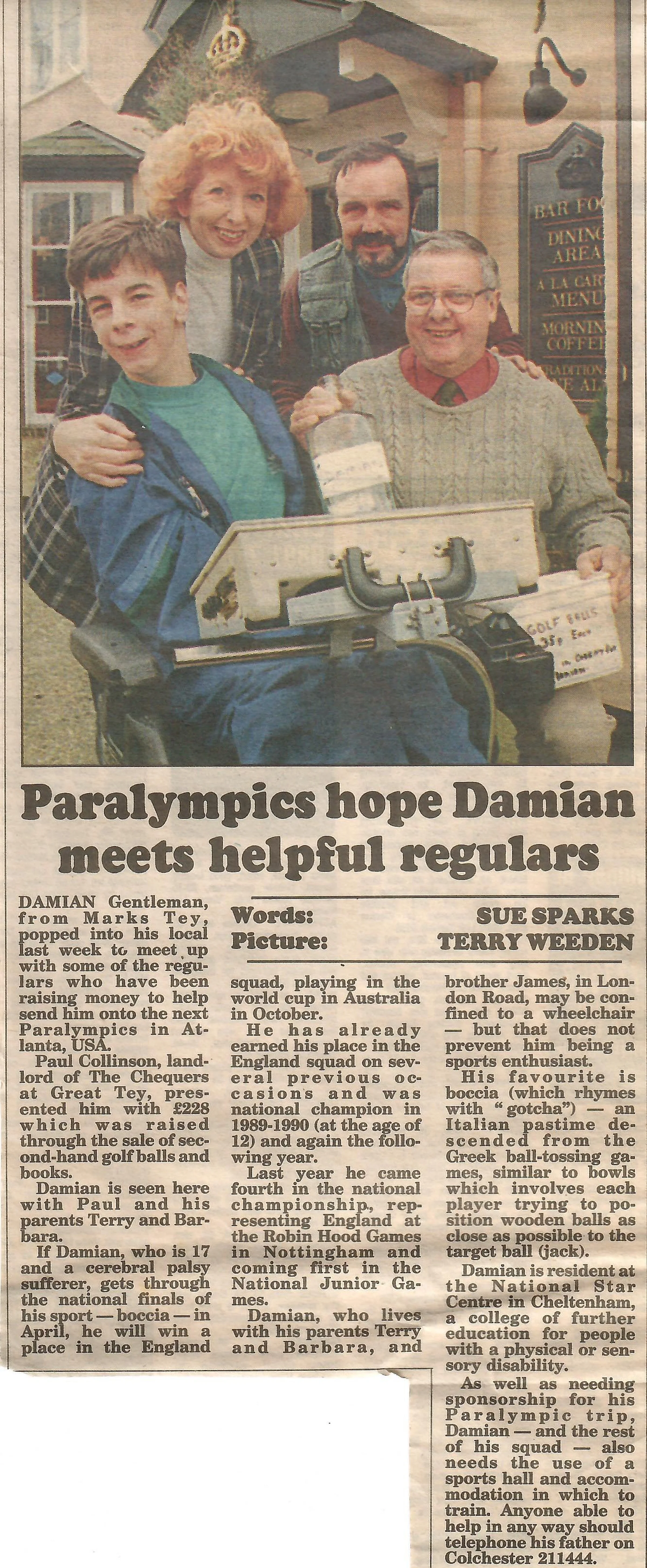 Newspaper photograph and report regarding fundraising for Damian Gentleman to attend the Paralympics.
