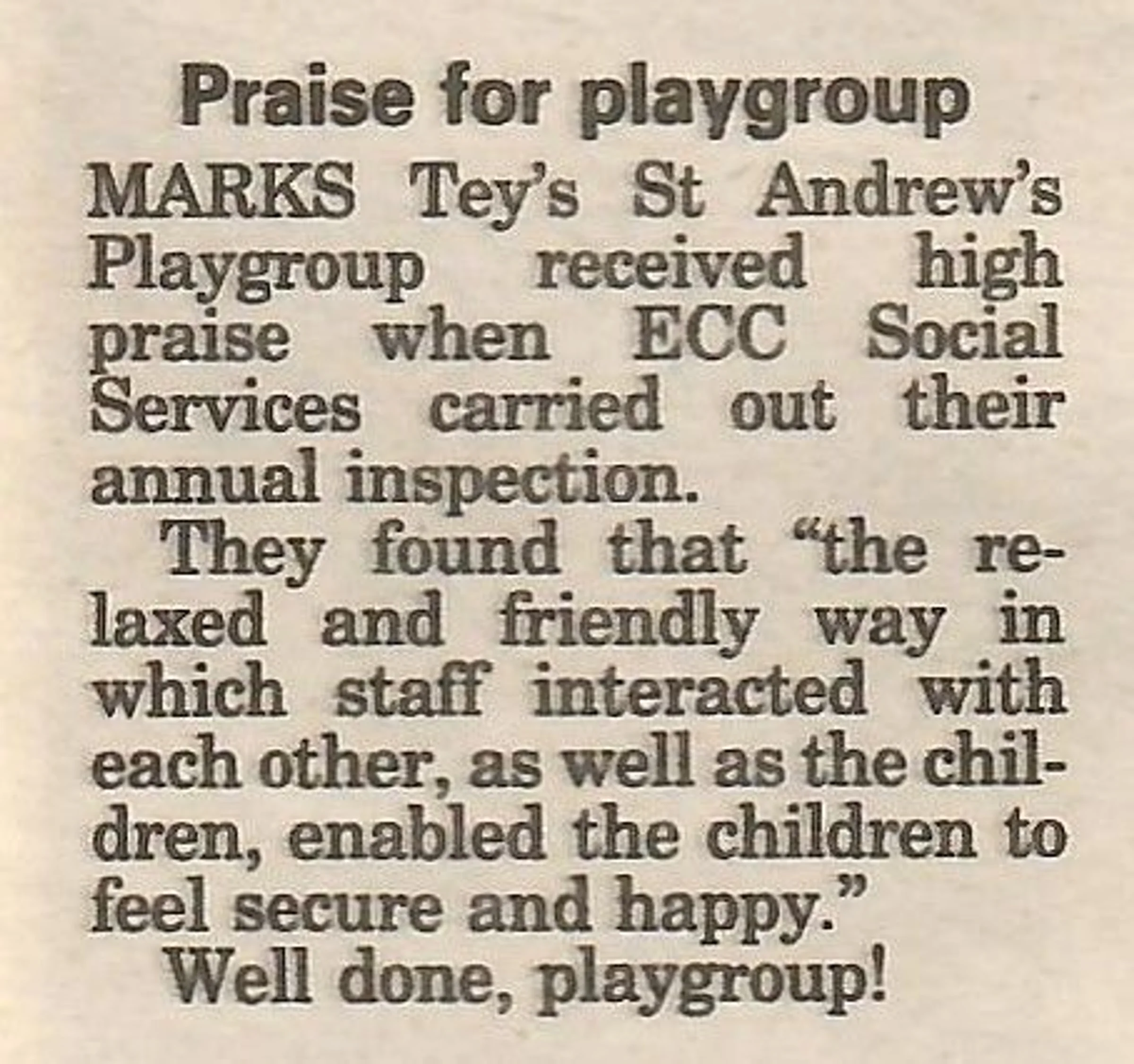 Village news column reporting on the inspection of St Andrew's Playgroup.