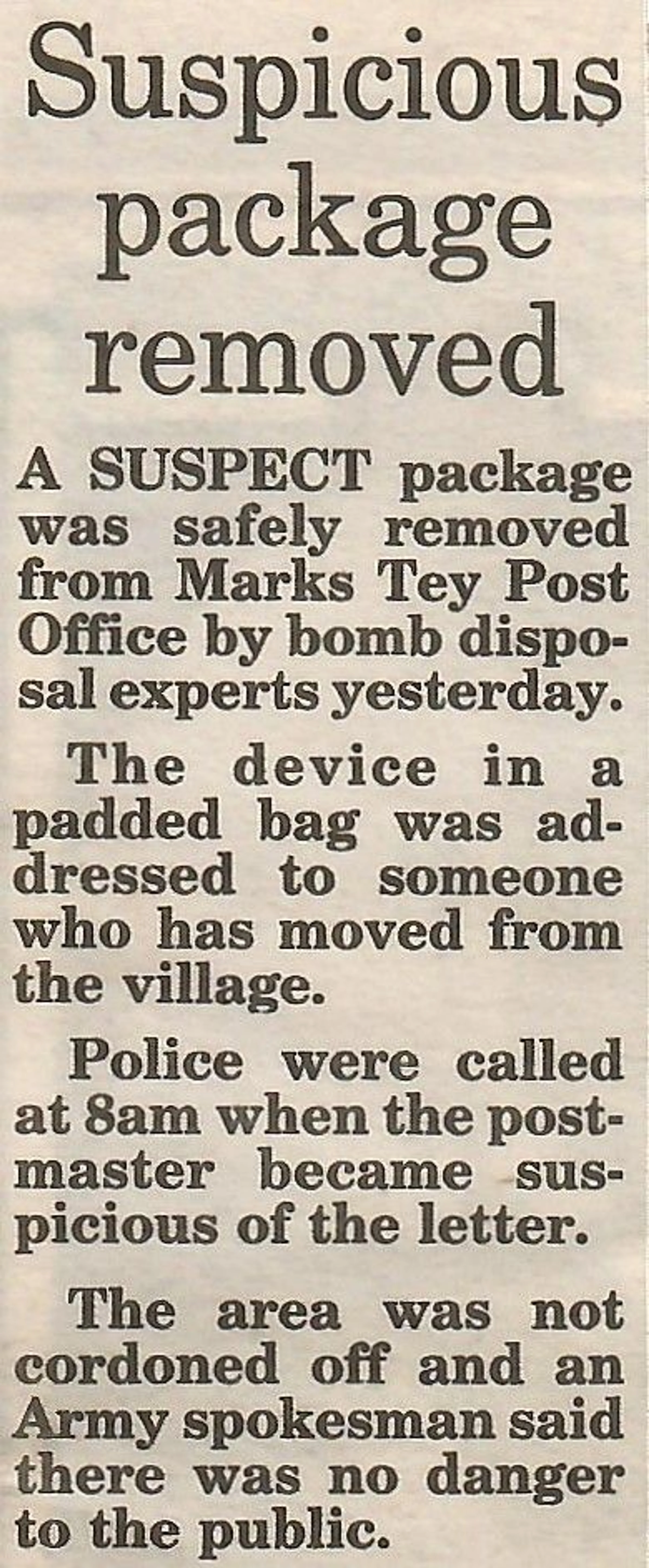 Newspaper report on the removal of a package by bomb disposal experts, at Marks Tey Post Office.