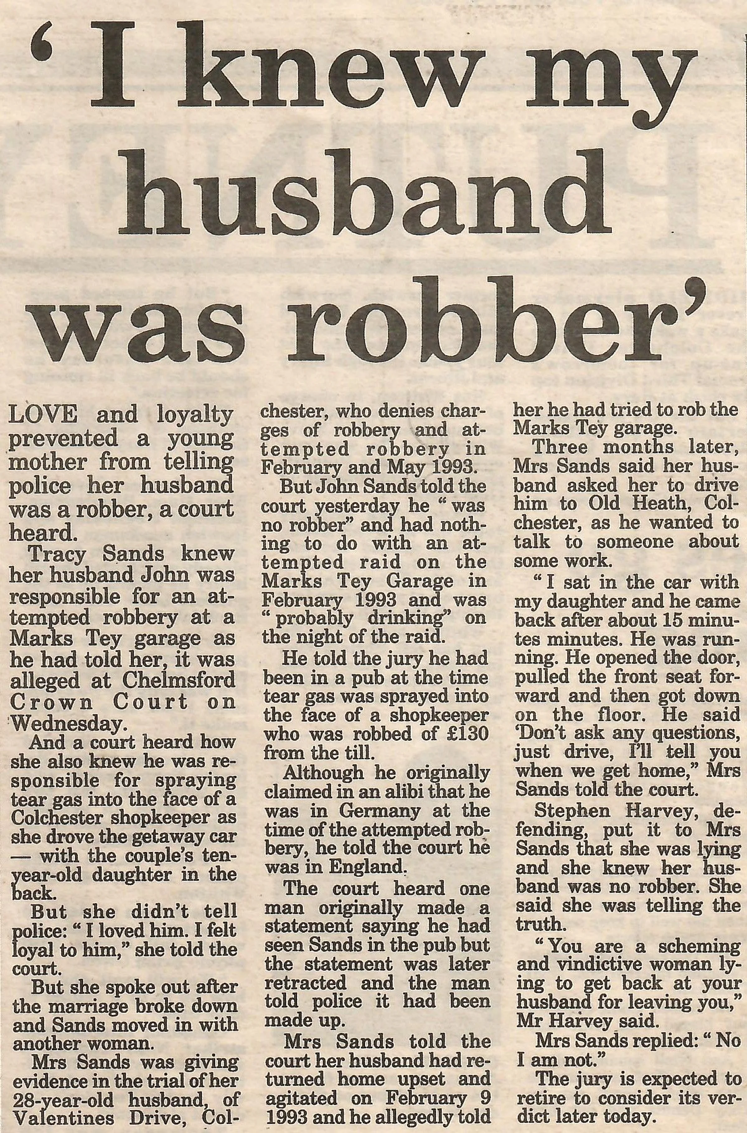 Newspaper report regarding the robbery at Marks Tey Garage.
