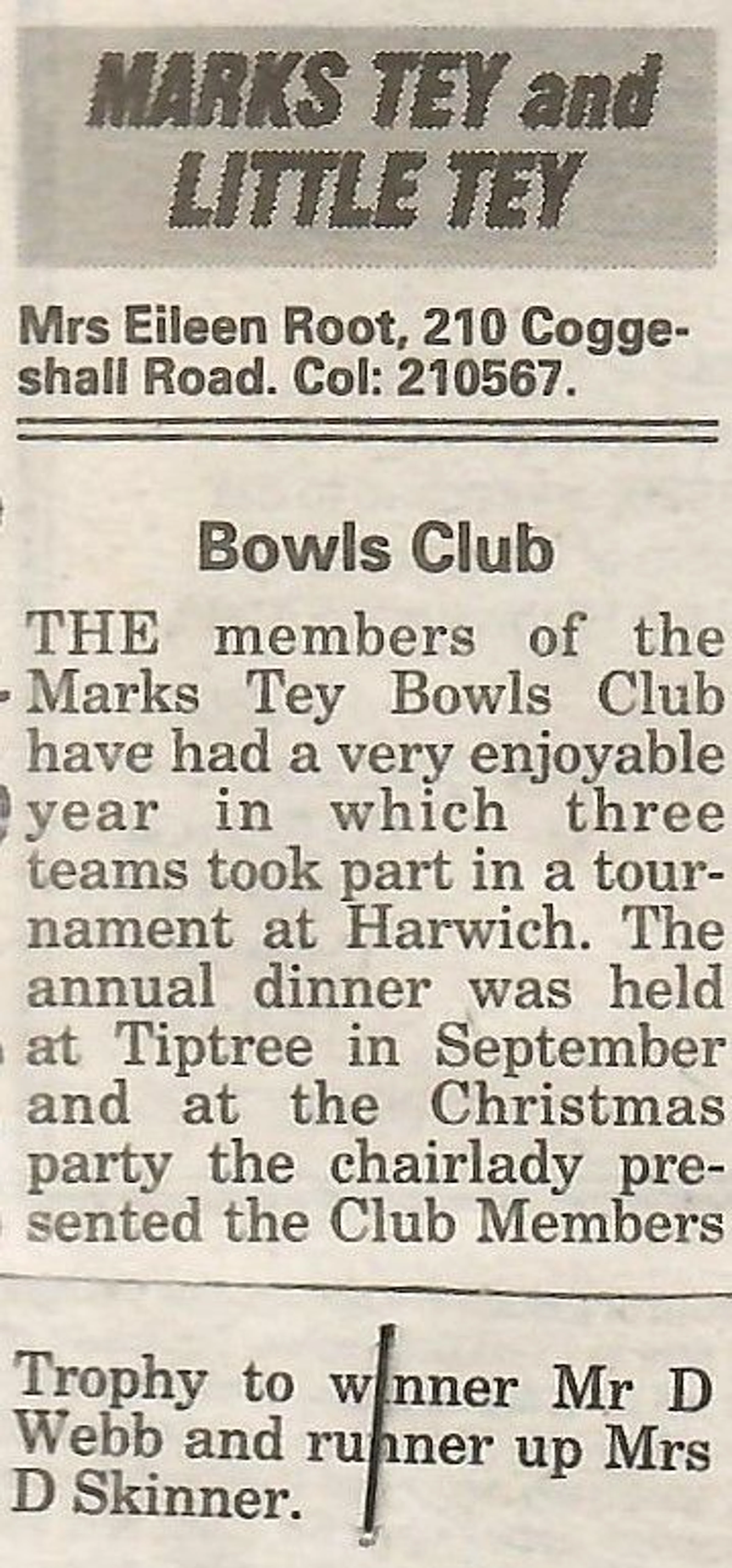 Village news column reporting on the Marks Tey Bowls Club.