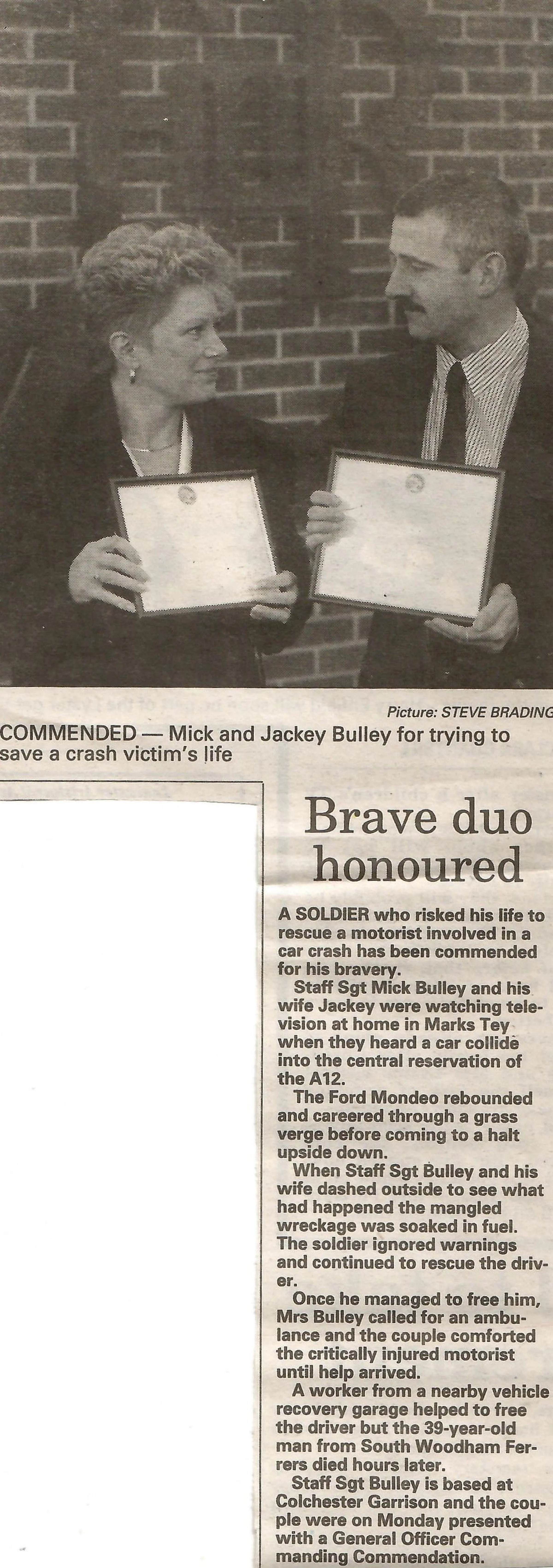 Newspaper photograph and report regarding a bravery award given to Mick and Jackie Bulley.