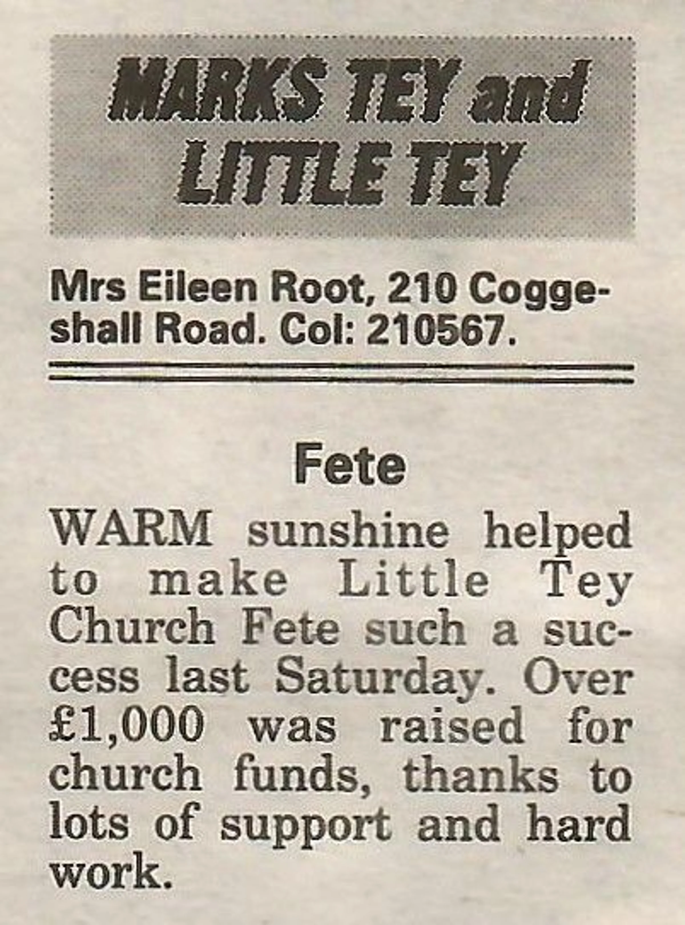 Village news column reporting on the Little Tey Church fete.