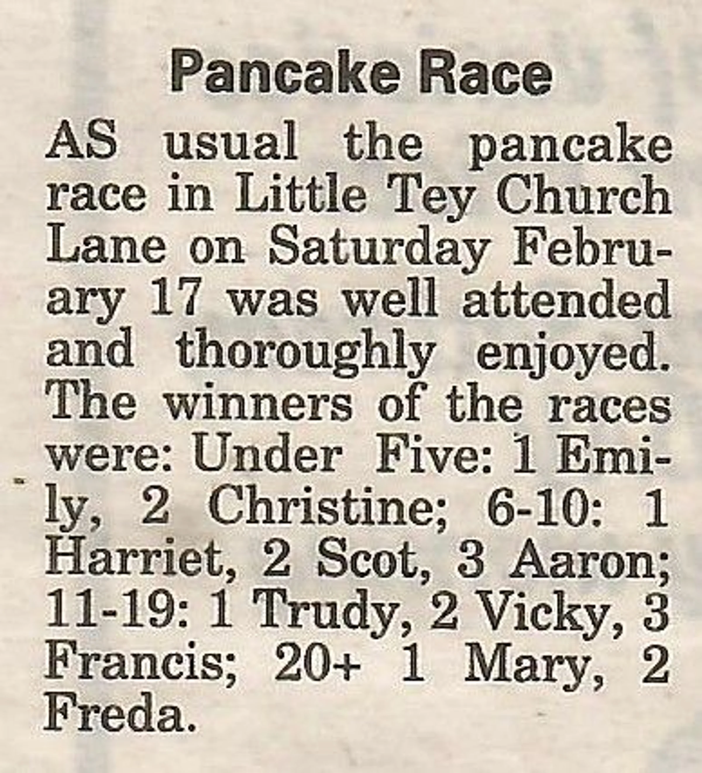 Village news column reporting on the pancake race in Little Tey.
