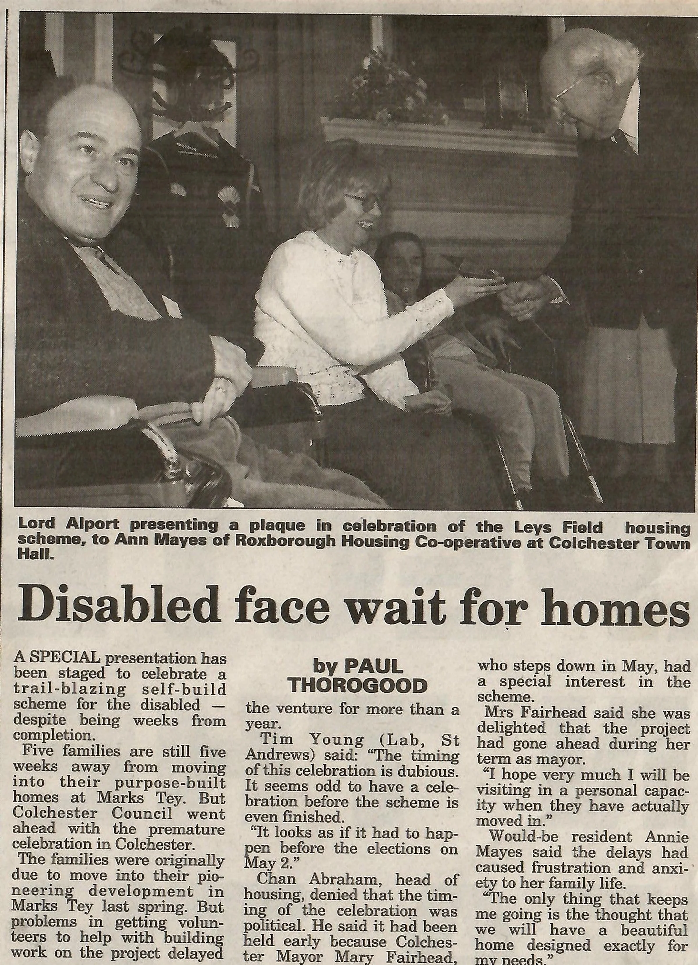 Newspaper report regarding the celebration for the completion of the self build bungalows for residents with disabilities.
