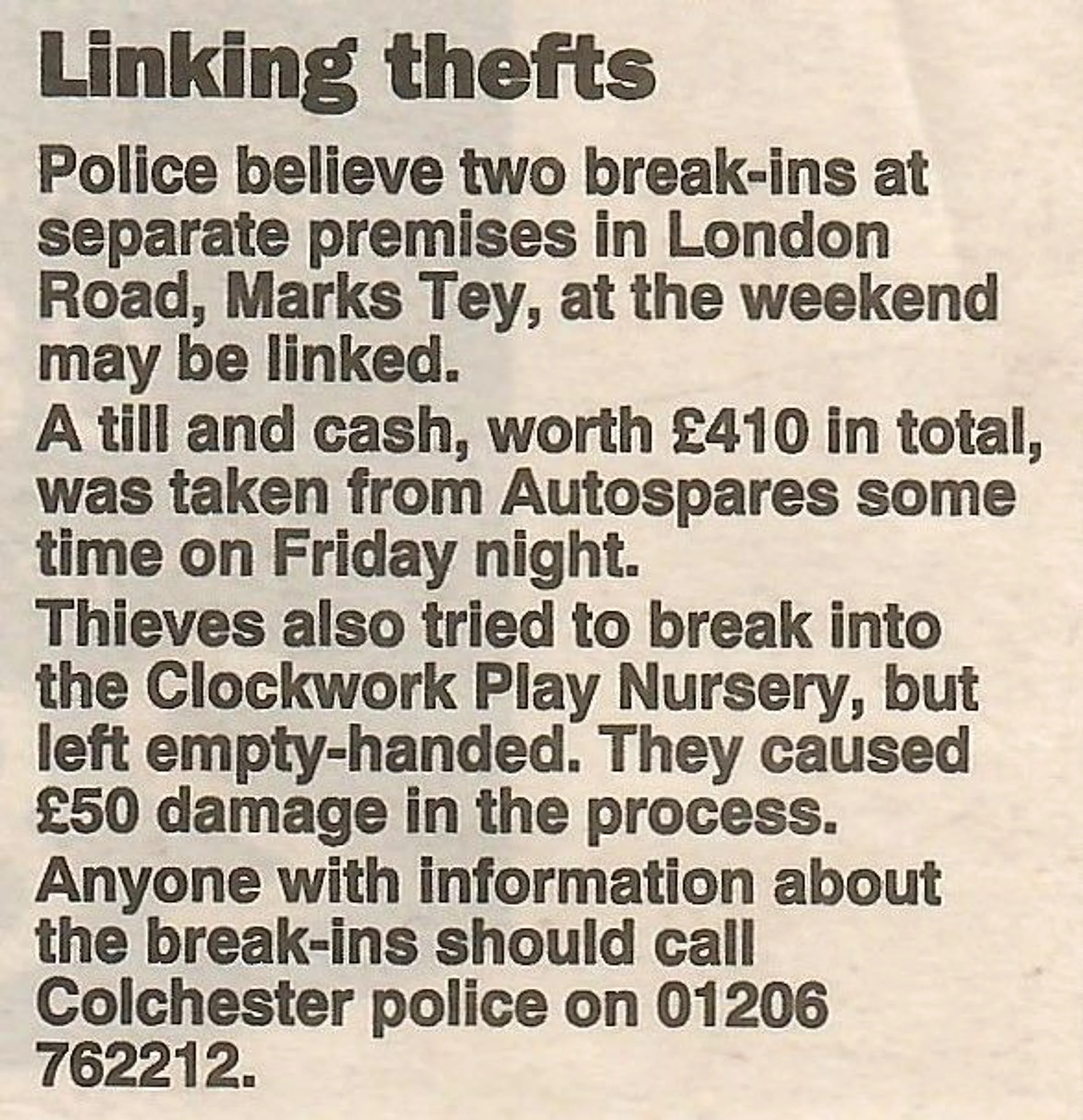 Newspaper report regarding two burglaries at Auto Spares and Clockwork Play Nursery.