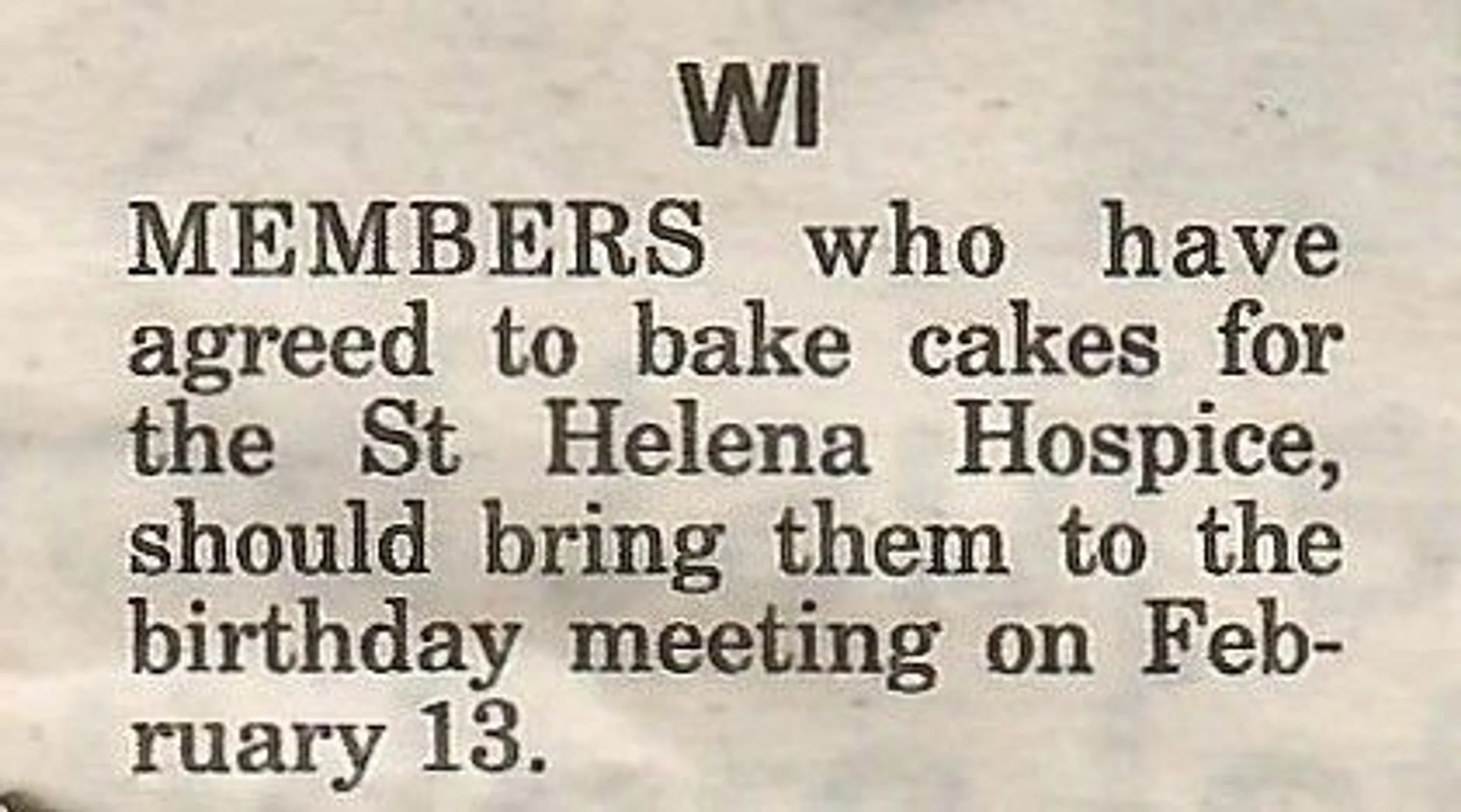Local news column notice regarding a charity cake event by the Women's Institute.